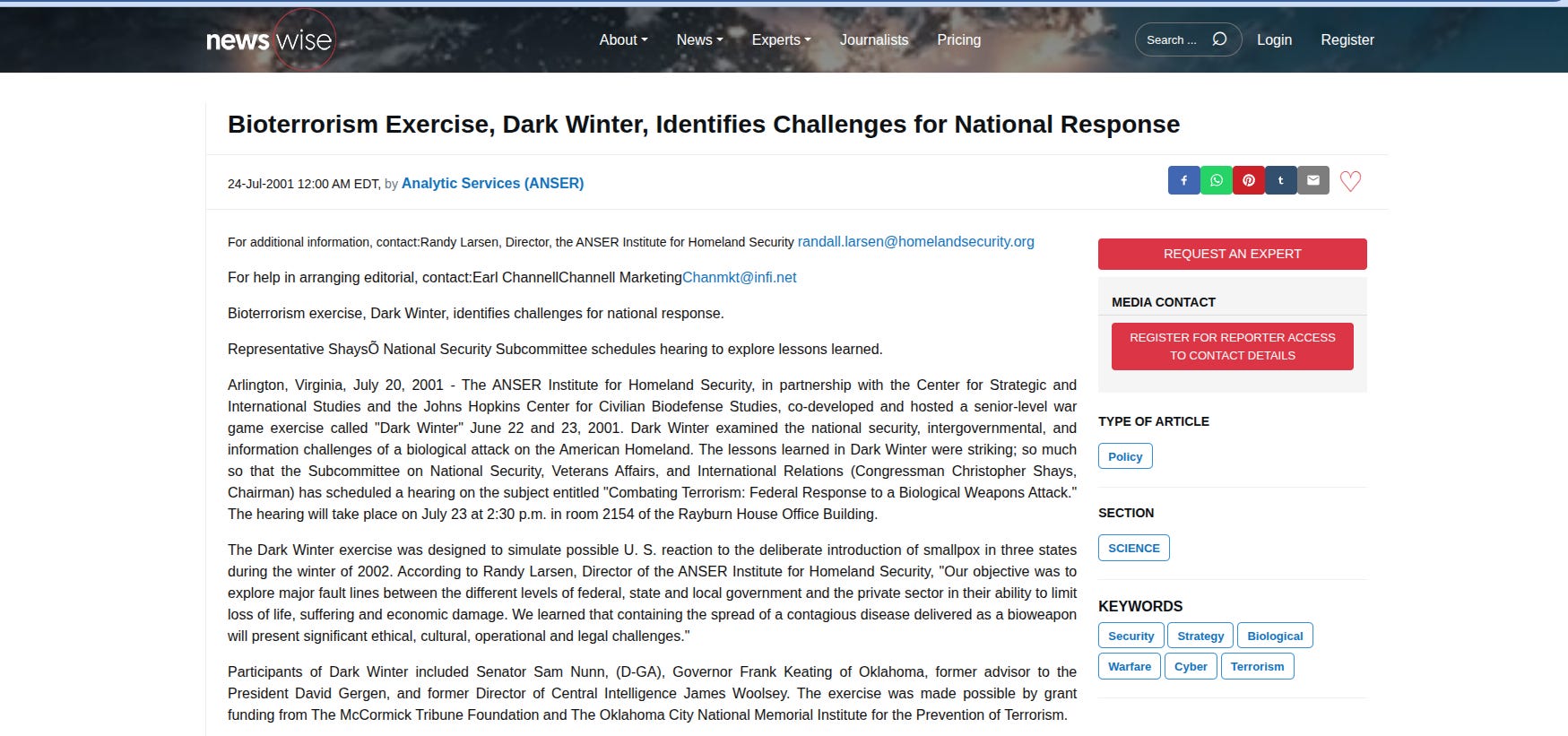 Conducted June 22-23, 2001 at Andrews Air Force Base by Johns Hopkins Center for Civilian Bio defense Strategies and CSIS, this smallpox bioterrorism simulation featured former senior officials including Senator Sam Nunn (of the NTI) as President and David Gergen as National Security Advisor responding to a covert attack across multiple NSC meetings. The exercise revealed catastrophic system failures with hospitals overwhelmed, state borders becoming chokepoints, and international travel restrictions, projecting 3 million infected and 1 million dead. Vice President Cheney called the results ‘terrifying’ after a post-9/11 briefing, leading to immediate vaccine stockpile orders and establishing the template for emergency powers activation and federal override of state authorities during health crises.