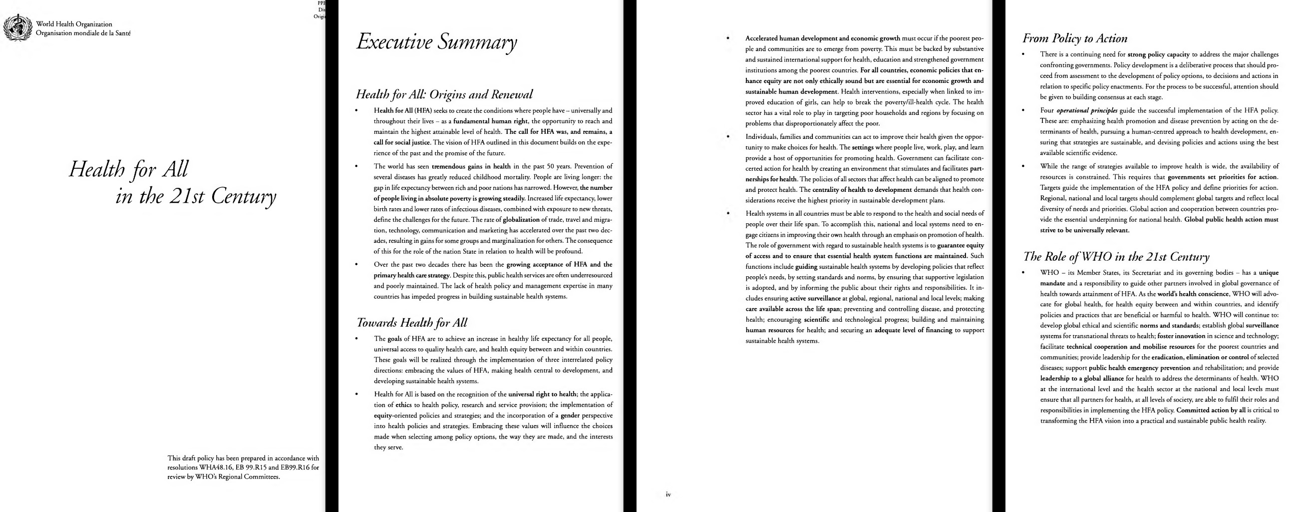 Building on the Lalonde Report's cross-sectoral health framework, WHO and UNICEF convened the International Conference on Primary Health Care in Alma-Ata, Kazakhstan, resulting in the Declaration of Alma-Ata that proclaimed health as a 'fundamental human right' and called for global cooperation to achieve 'Health for All by the year 2000'. While framed in humanitarian language, Alma-Ata laid the groundwork for a centralised clearinghouse model of health governance with expert-determined information, education, vaccines and drugs, but community-level implementation administered through interagency mechanisms and standardised indicators. Crucially, Alma-Ata normalised the idea that international institutions and technical experts — not sovereign governments — should set public health agendas, creating the foundational legal framework for future surveillance, resource allocation, and behavioural intervention models under the banner of ‘equity’ and access.Pandemic Preparedness Architecture (1978)