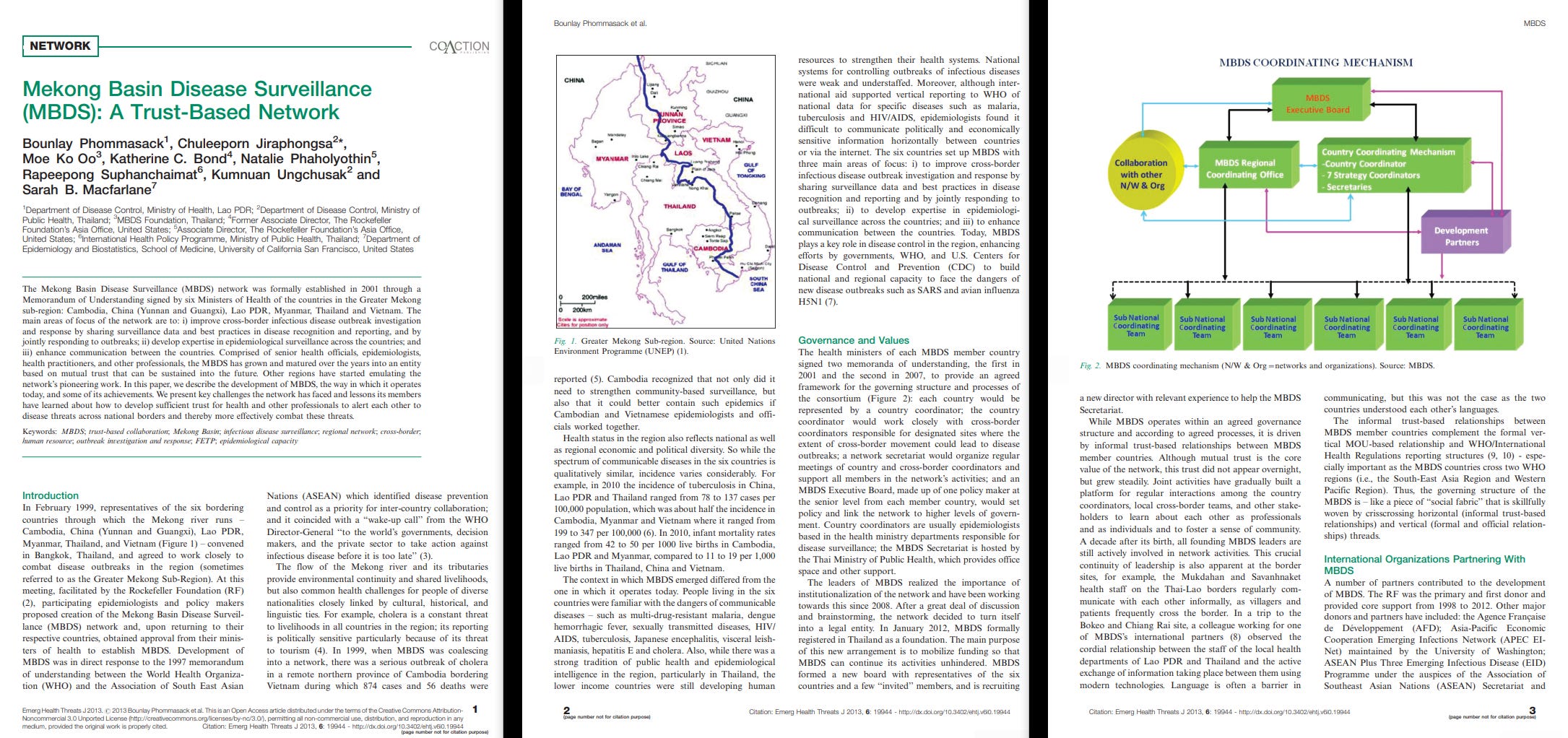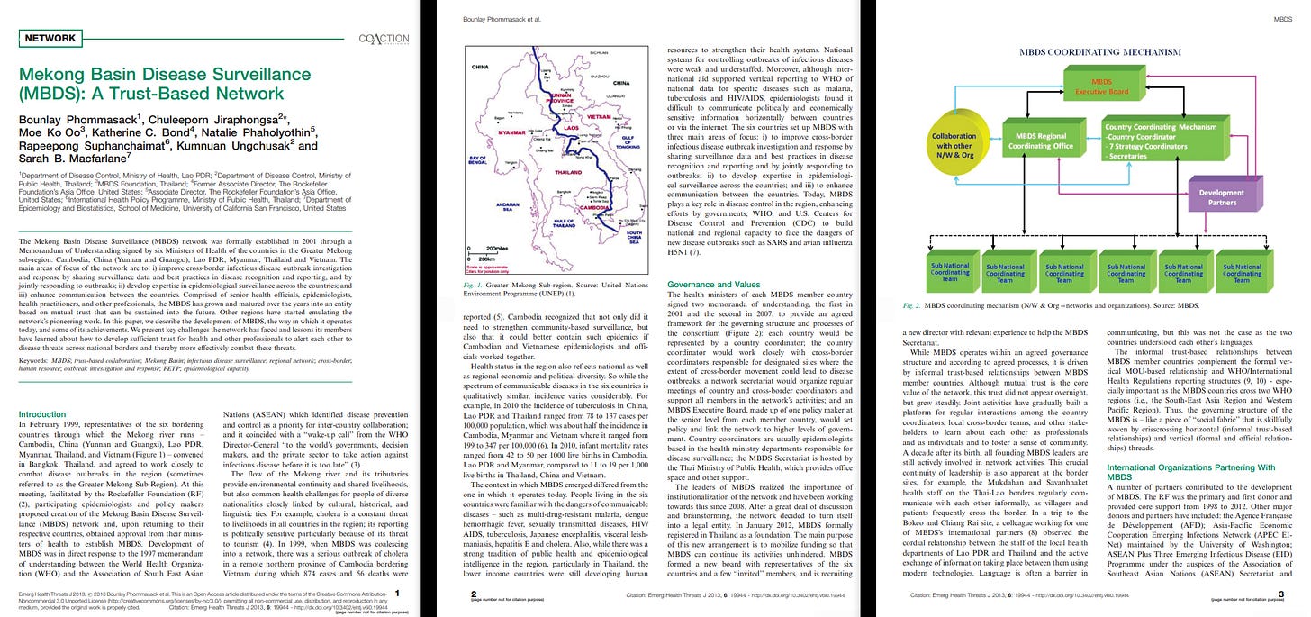Building directly on the public-private coordination mechanisms established in the 1998 vaccine industry meeting, WHO's foundational pandemic preparedness document was entirely authored by members of ESWI, demonstrating complete regulatory capture of the world's primary health authority by pharmaceutical industry interests. This plan established global surveillance protocols, stockpiling requirements, expedited approval processes, and liability waivers that directly served pharmaceutical commercial interests whilst being presented as independent WHO policy based on the scientific frameworks published in CDC-EID. The document aligned with parallel US and European pandemic plans developed in 1997, creating a coordinated international framework that prioritised vaccination over treatment options whilst establishing the precedent for industry-written health policy being adopted as official international law, operationalising the expert network model developed through ESWI into binding international obligations.Mekong Basin Disease Surveillance (MBDS) (1999)19