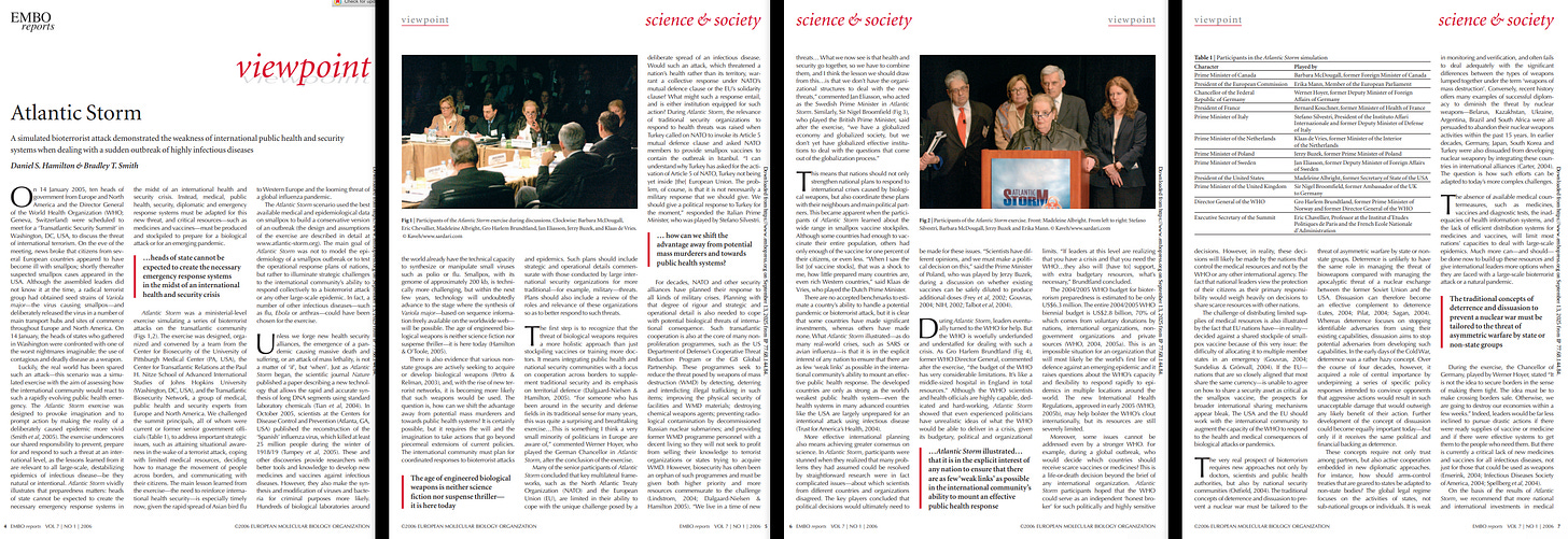 In November 2004, vaccine manufacturers including Johnson & Johnson, GlaxoSmithKline, AstraZeneca, Aventis, and Merck met with WHO representatives to establish the commercial framework for pandemic preparedness, with Canada's Theresa Tam in official attendance. The pharmaceutical companies presented a comprehensive wish list: liability protection, public R&D funding, long-term government contracts, regulatory fast-tracking, increased routine flu vaccination to build manufacturing capacity, and intellectual property protections. They requested WHO coordinate global vaccine distribution while governments subsidized production costs and guaranteed purchase agreements regardless of pandemic occurrence. The meeting formalised the business model where public health emergencies would trigger predetermined commercial arrangements, transforming pandemic preparedness into a profit-guaranteed industry. Notably absent was Pfizer, which later sponsored One Health initiatives in 2005, suggesting commercial competition rather than coordinated planning drove early surveillance state development.This January 14, 2005 ministerial exercise by UPMC Center for Biosecurity and Johns Hopkins simulated coordinated smallpox bioterrorist attacks in six major cities, with current and former government officials playing heads of state in a transatlantic summit response. The scenario showed 51 initial cases exploding to 3,320 cases across borders in just 4.5 hours, demonstrating rapid international disease spread and revealing that NATO and EU frameworks were inadequate for pandemic coordination. Atlantic Storm established WHO as the ‘ideal entity to coordinate international response’ while proving most countries lacked adequate pandemic infrastructure, creating precedents for subordinating national sovereignty to international health coordination mechanisms.
