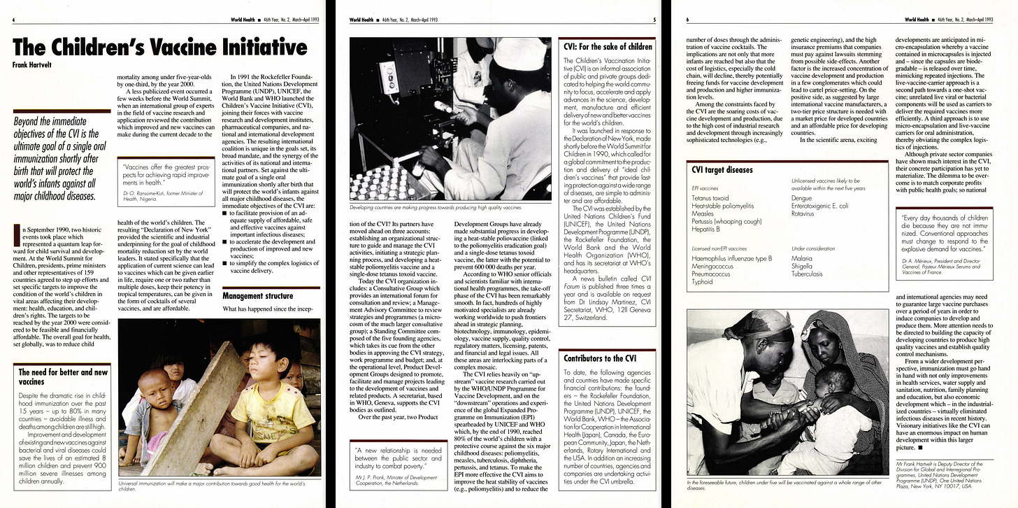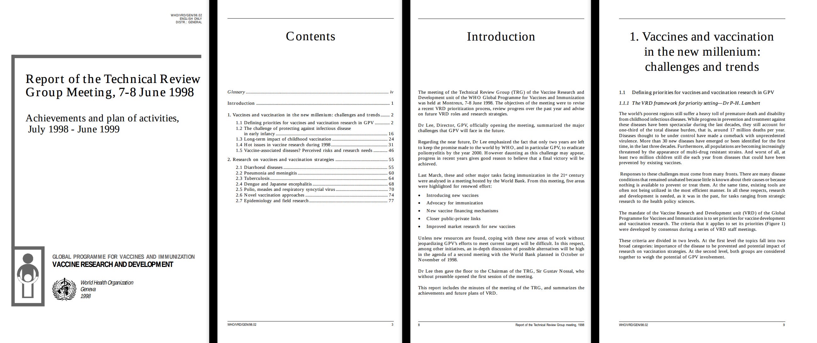 This early coordination meeting brought together WHO, Rockefeller Foundation, World Bank, UNICEF, Children's Vaccine Initiative, and twelve pharmaceutical companies to operationalise the public-private partnership frameworks theoretically established through ESWI whilst building on the scientific justifications published in CDC-EID. The meeting established templates for vaccine development that integrated the surveillance data streams created through GEIS with commercial pharmaceutical interests, calling for increased uptake in existing vaccines whilst coordinating with the marked surge in Rockefeller Foundation surveillance-related investments beginning in 1998.