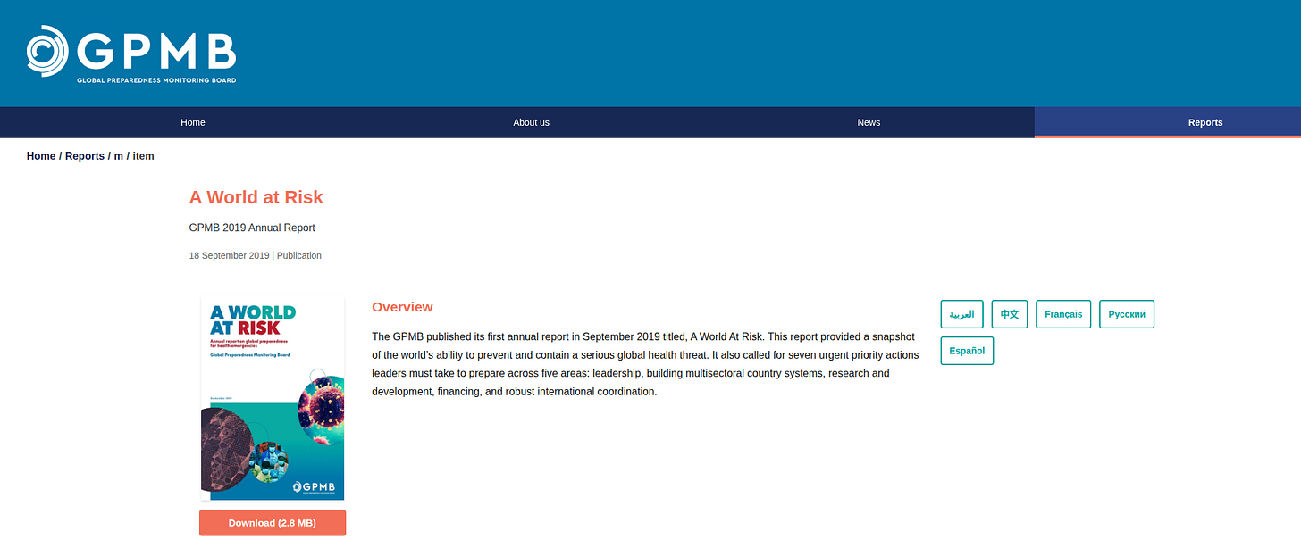 The Global Preparedness Monitoring Board's first annual report, published in September 2019, warned specifically of a ‘fast-moving airborne pandemic that could kill up to 80 million people, disrupt economies and create social chaos’ just months before COVID-19 emerged. The WHO-World Bank joint initiative called for countries to develop ‘surge manufacturing capacity’, immediately share genome sequences of new pathogens, and integrate pandemic preparedness with economic risk planning through the IMF and World Bank. The report criticised the ‘cycle of panic and neglect when it comes to pandemics’ and demanded seven urgent actions across leadership, multisectoral country systems, research and development, financing, and robust international coordination. Led by former WHO Director-General Gro Harlem Brundtland, the board's prescient warnings and specific recommendations were operationalised during the COVID-19 response, demonstrating that pandemic planning had advanced to detailed implementation blueprints years before the declared emergency.Crimson Contagion (2019)80