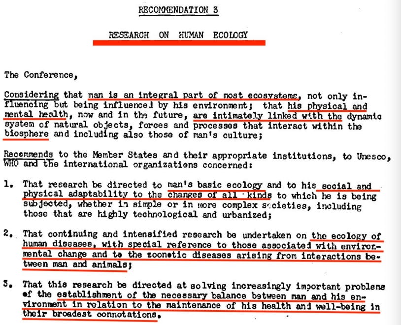 The 1968 UNESCO Biosphere Conference marked the first institutional articulation of population-level ecological balance as a governance objective. Microbiologist René Dubos authored recommendation 3, which declared the need to balance humanity with nature (3.3), and that environmental change would lead to zoonotic disease (3.2). This laid the moral and philosophical groundwork for integrating human health into environmental governance. Dubos later advised the 1972 UN Stockholm Conference, where the slogan 'think globally, act locally' reinforced the idea that individual behavior could — and should — be aligned with planetary system optimisation.Man and His Environment: A View Toward Survival (1969)1