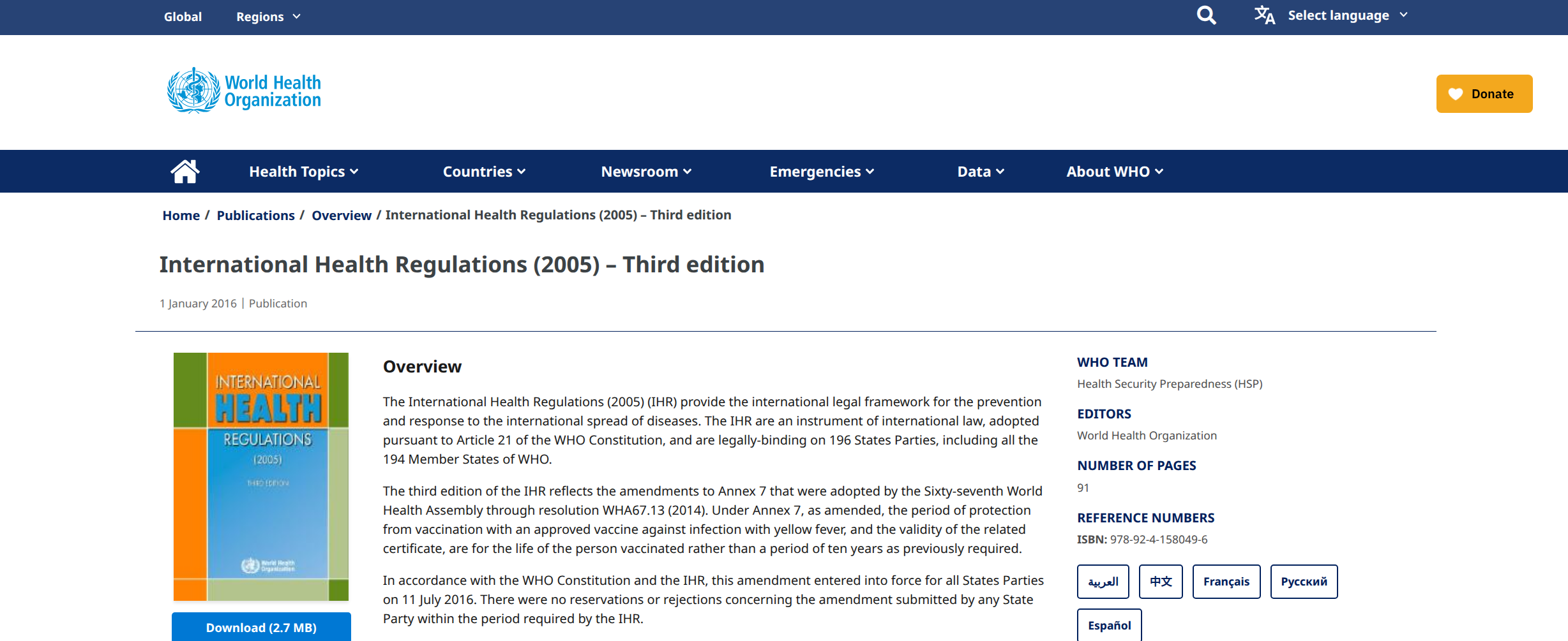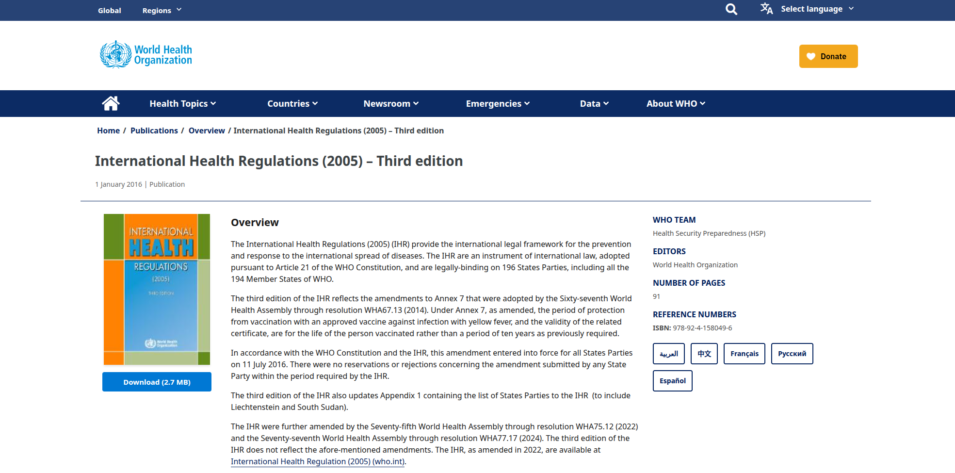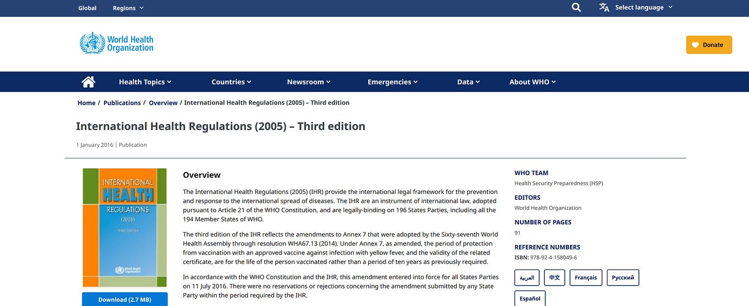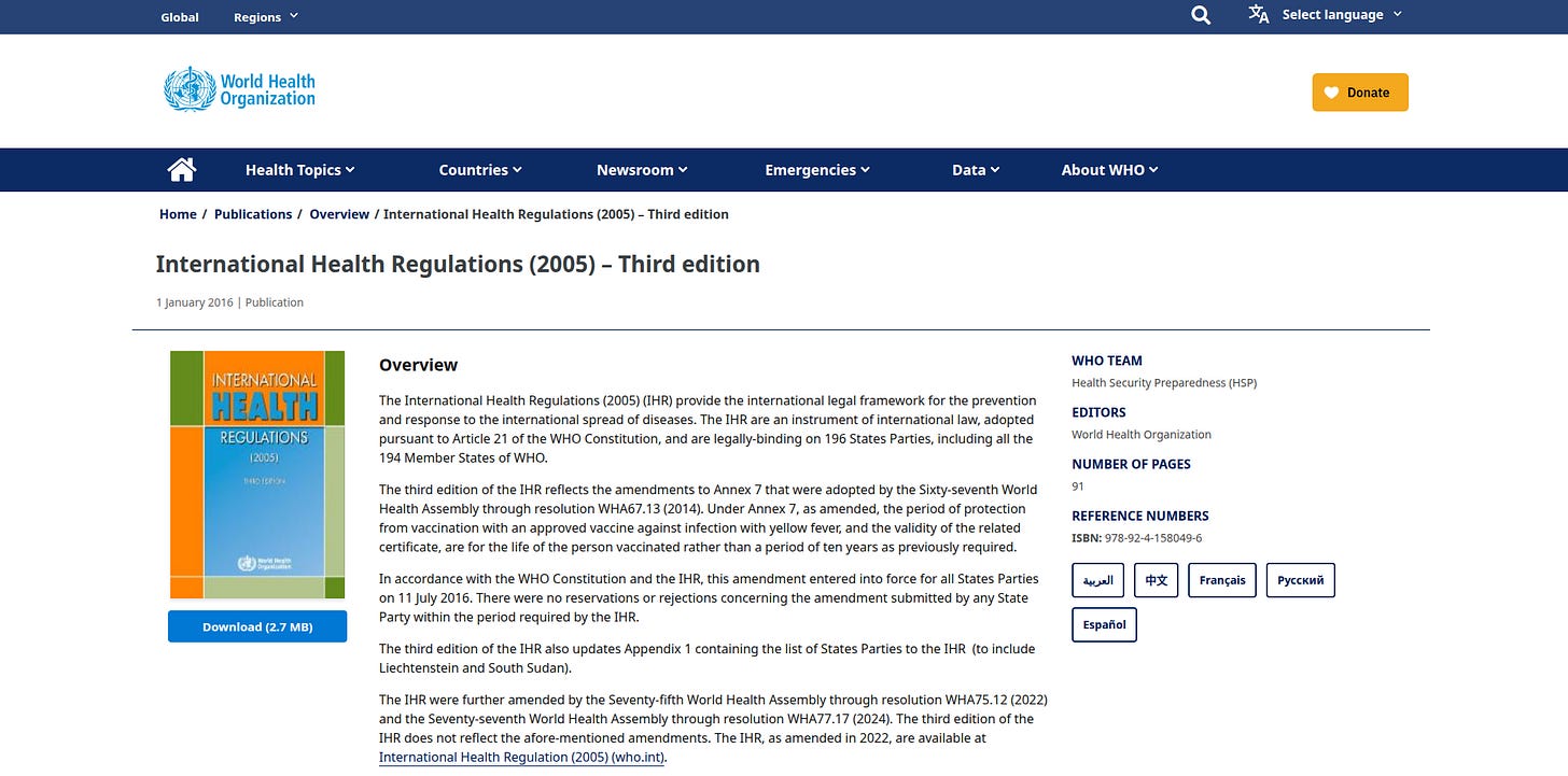 WHO's revised IHR established the legal architecture for supranational health governance, codifying the organisation's authority to declare Public Health Emergencies of International Concern (PHEIC) and mandate coordinated global responses. The regulations created binding obligations for member states to develop core surveillance capacities, share health data in real-time, and implement WHO-recommended measures during declared emergencies. Unlike the previous 1969 regulations limited to cholera, plague, and yellow fever, the 2005 framework expanded WHO authority to ‘public health emergencies of international concern’ of any origin — biological, chemical, or radiological. The IHR transformed temporary emergency coordination into permanent legal obligations, establishing standardised reporting mechanisms, early warning systems, and compliance monitoring that effectively subordinated national health sovereignty to technocratic global governance. This legal framework provided the foundation for WHO's COVID-19 response powers and the ongoing Pandemic Treaty negotiations.BARDA Formation (2006)41