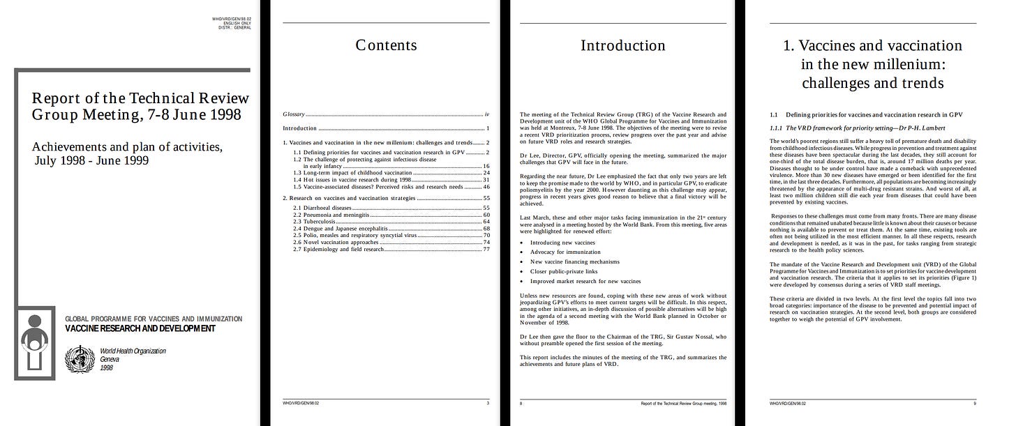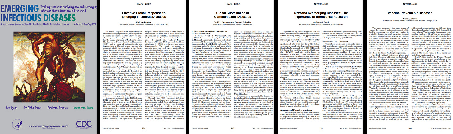 This issue of Emerging Infectious Diseases provided the scientific justification for the surveillance infrastructure being constructed through GEIS and the 1997 Pandemic Plan, featuring articles that aligned precisely with military and international health governance objectives established through DoD's global monitoring networks. With star-studded contributions from Anthony Fauci, Joshua Lederberg, Stephen A Morse, Donna Shalala and others, this publication reinforced themes of global disease threats, zoonotic spillover risks, vaccination, and the necessity of coordinated international surveillance systems whilst legitimising the integration of animal, environmental, and human health monitoring developed through UNEP GEMS and militarised through GEIS. The timing and content demonstrated seamless coordination between CDC academic publications and the operational surveillance networks being deployed, providing peer-reviewed scientific cover for the militarisation of global health monitoring and the expansion of predictive modelling capabilities that would justify population-level interventions based on the algorithmic decision-making precedents established during the BSE and H5N1 crises.WHO Vaccine Industry Coordination Meeting (1998)17