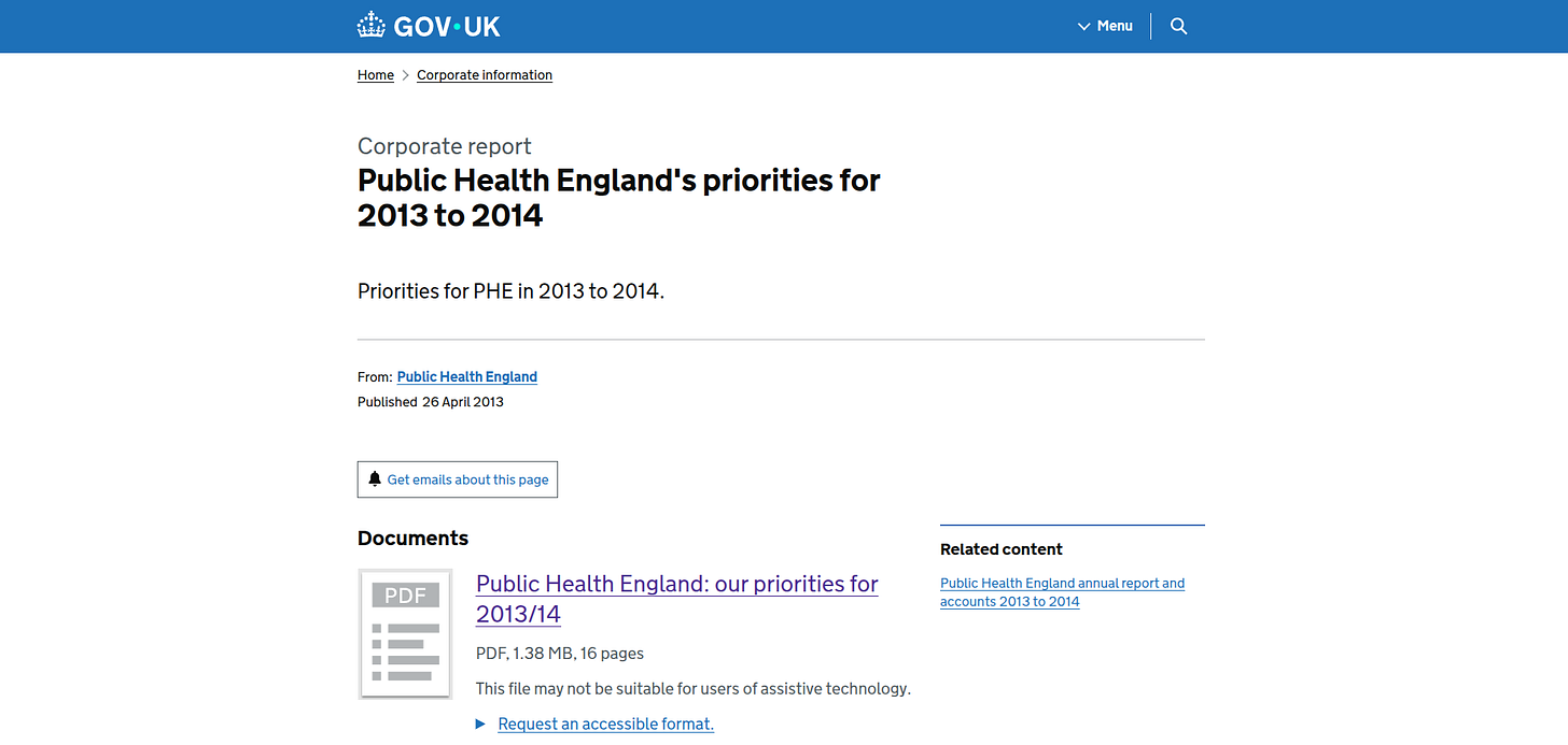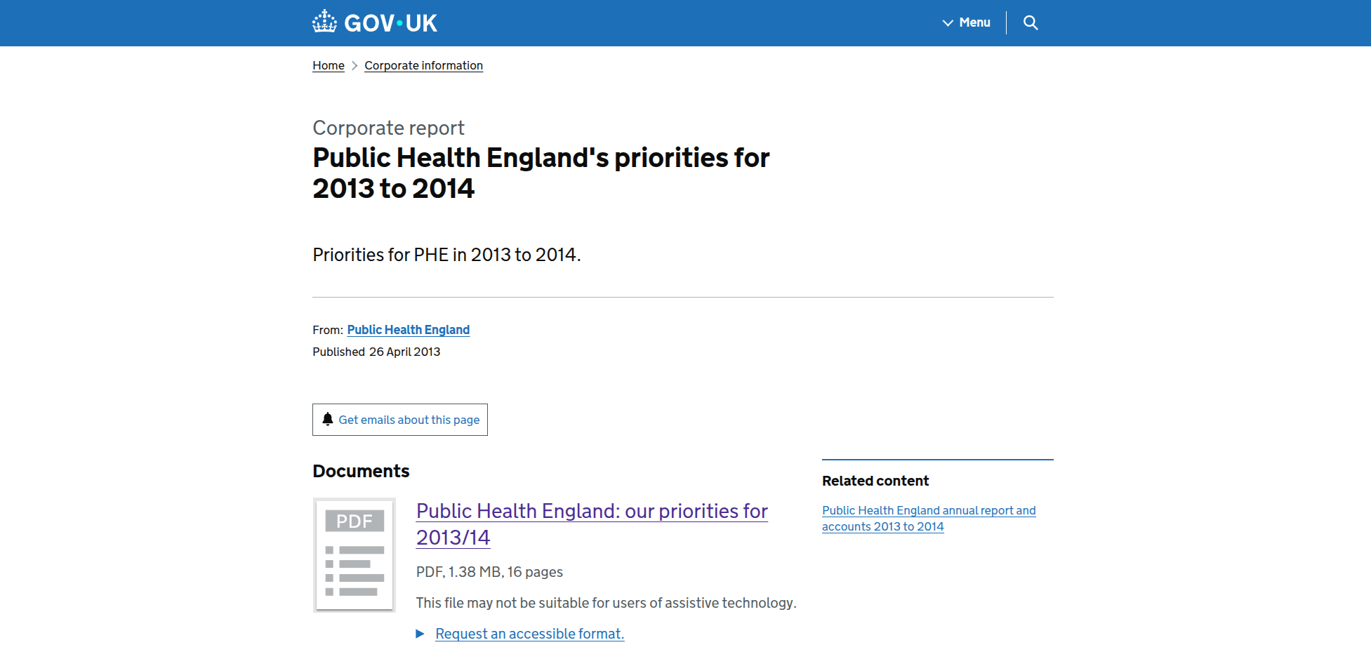 Public Health England, established as an executive agency on April 1, 2013, immediately implemented One Health surveillance frameworks through its joint report on antibiotic use and resistance across human and animal populations. The UK One Health Report brought together surveillance data from 2013 on antibiotic resistance in bacteria common to both animals and humans, establishing integrated monitoring systems that evaluated data ‘side by side’ to assess relationships between antibiotic sales, use, and resistance across sectors. PHE's founding priorities document emphasized building ‘the public health system’ with responsibility spanning ‘jobs, housing and communities’ through local government integration, creating a new model where public health authority extended beyond traditional medical domains. This represented the UK's operationalisation of One Health principles through centralised data collection, cross-sector surveillance integration, and the expansion of health governance into economic and social spheres, establishing the institutional framework later used for COVID-19 response coordination and population-level interventions.Global Health Security Agenda (GHSA) (2014)59