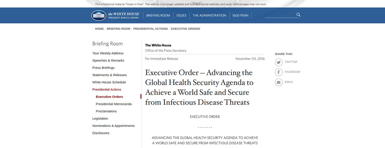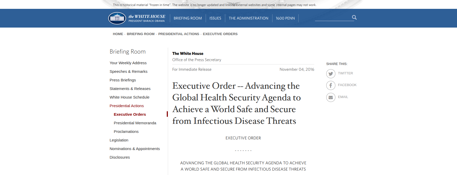 The 60 by the U.S. and ~44 founding partners, later expanding to 60–70 nations and organisations . It formalised health governance under security logic, introducing ‘Action Packages’61 that set binding targets and accountability metrics for epidemic preparedness and core disease competencies. GHSA’s Joint External Evaluations62 and scorecards tied national pandemic response to global benchmarks, embedding health within formal international law and national security frameworks.Obama One Health (2015)63
