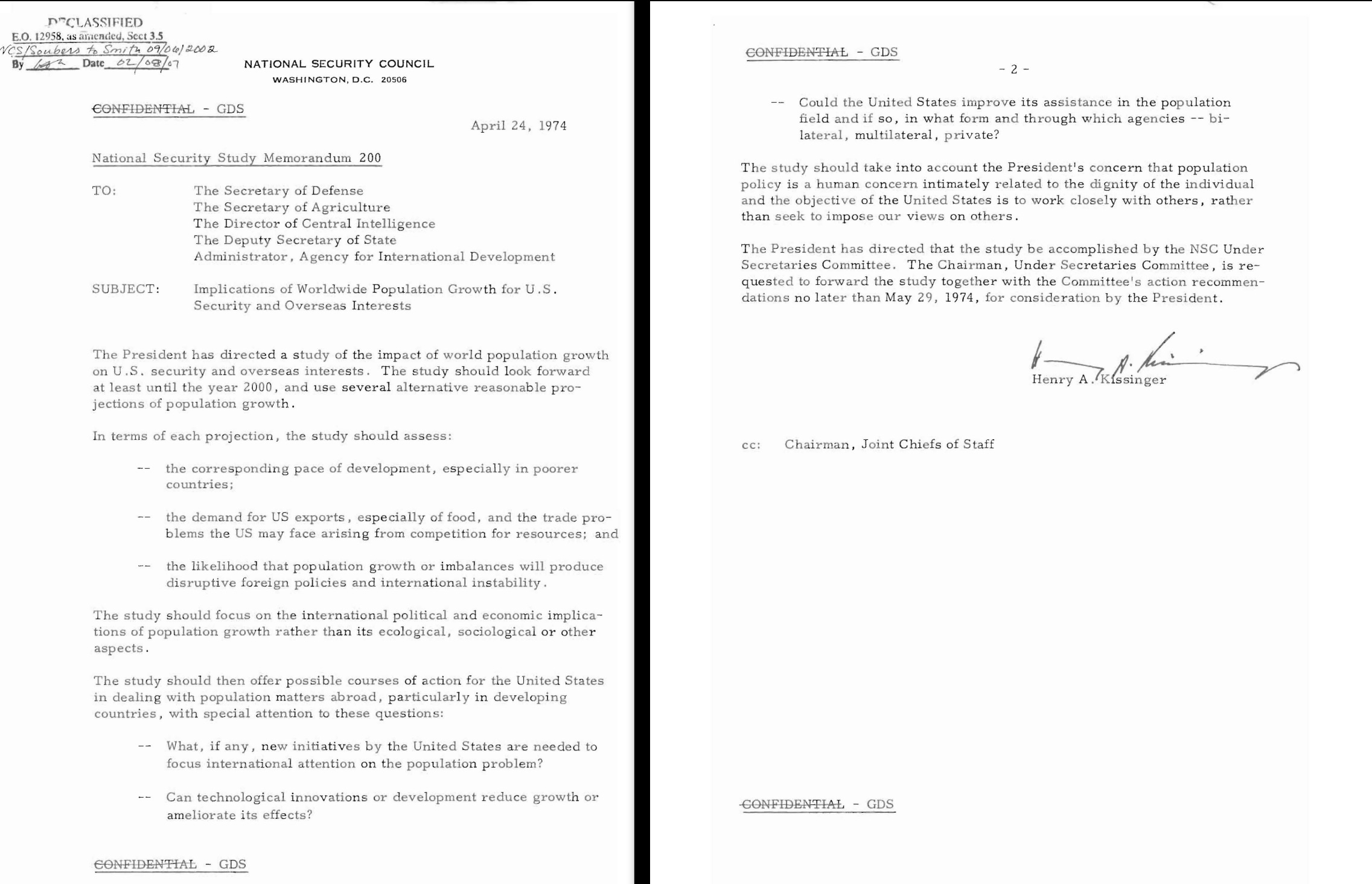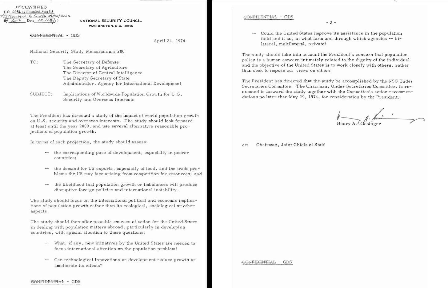 This classified US National Security Study Memorandum explicitly linked population growth to national security threats, providing the strategic foundation for integrating population-focused health interventions with geopolitical objectives. The report identified rapid population growth in developing nations as destabilising to US interests, recommending coordinated international programmes to reduce fertility rates through health system expansion and family planning initiatives. NSSM 200 established the conceptual framework for treating demographic trends as security issues requiring systematic intervention, creating the strategic rationale for embedding population control within humanitarian health programmes and justifying international oversight of domestic reproductive and health policies under the guise of development assistance and global stability.Swine Flu (1976)