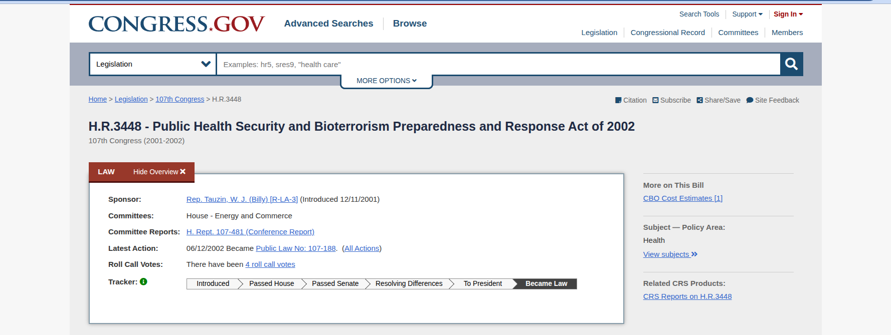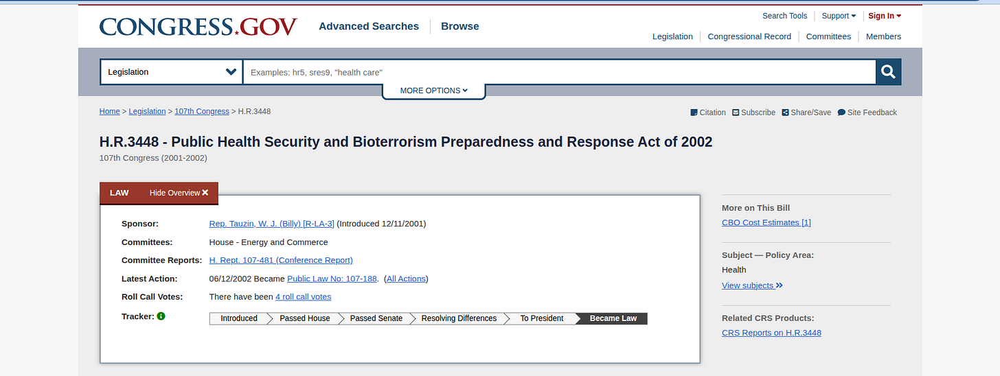 Following the October 2001 anthrax letter attacks that infected 22 people an killed 5, model legislation was proposed to update state public health laws to meet bioterrorism threats through the Model State Emergency Health Powers Act. Congress responded by passing the Public Health Security and Bioterrorism Preparedness and Response Act of 2002 (P.L. 107-188), which authorised emergency interventions based on biological risk assessments and strengthened oversight of select agents through new HHS and USDA regulations. The Act established the Strategic National Stockpile, created federal grant programs for state and local bioterrorism preparedness, and required community water systems to conduct vulnerability assessments. Most significantly, the legislation normalised emergency powers activation through biological risk modeling rather than confirmed threats, creating the legal architecture for preemptive interventions based on expert assessments of potential biological dangers. This established the precedent for algorithmic threat assessment triggering emergency authorities that would later be operationalised during pandemic responses.