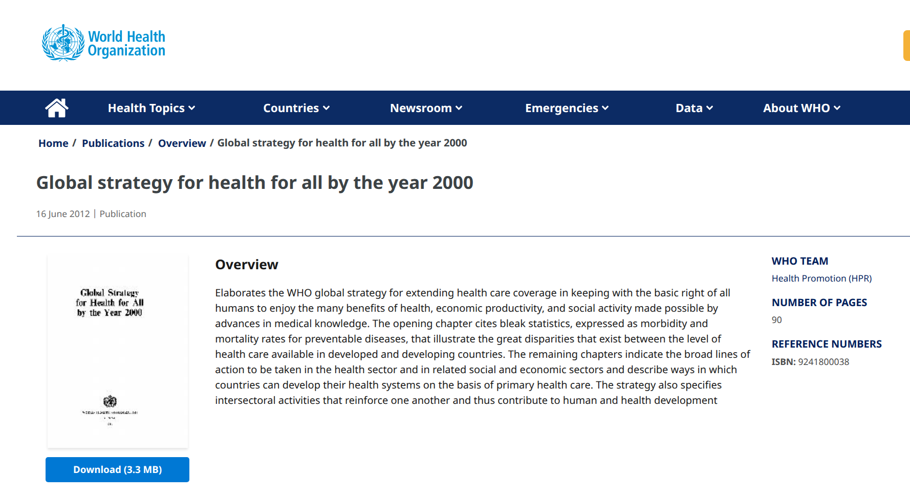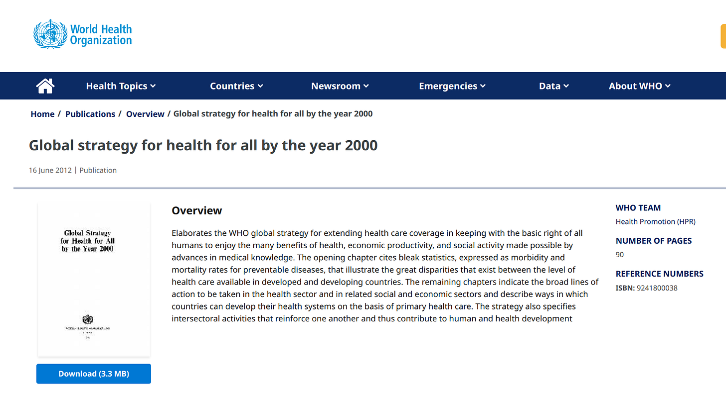 Canada's health minister Marc Lalonde published 'A New Perspective on the Health of Canadians', which redefined health not as a clinical outcome but as the result of four indirect factors: biology, environment, lifestyle, and healthcare systems, arguing that behaviour and environment had greater impact on health than medical treatment. This pivot marked the origin of the 'Social Determinants of Health' framework later adopted by WHO, justifying intervention in nearly every aspect of life — from diet and housing to education and employment. The Lalonde Report transformed public health into a cross-sectoral management problem, opening the door for algorithmic modelling of population behaviours and enabling non-medical institutions to shape health outcomes through policy, data, and infrastructure, perfectly complementing the surveillance systems being established through UNEP GEMS.Primary Health Care (1978): The Alma-Ata Declaration7