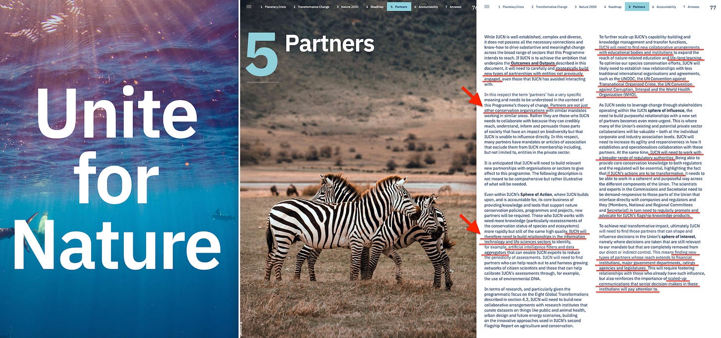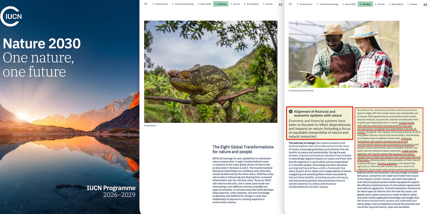 The governance model is stakeholder capitalism — with IUCN explicitly looking for new partners. The monetary mechanism hardly requires elaboration. The systems theory is pervasive — artificial intelligence, adaptive management, cybernetics, anticipatory governance, black-box modelling, NGFS-IIASA scenarios, IPCC reports, conditional CBDC transactions…