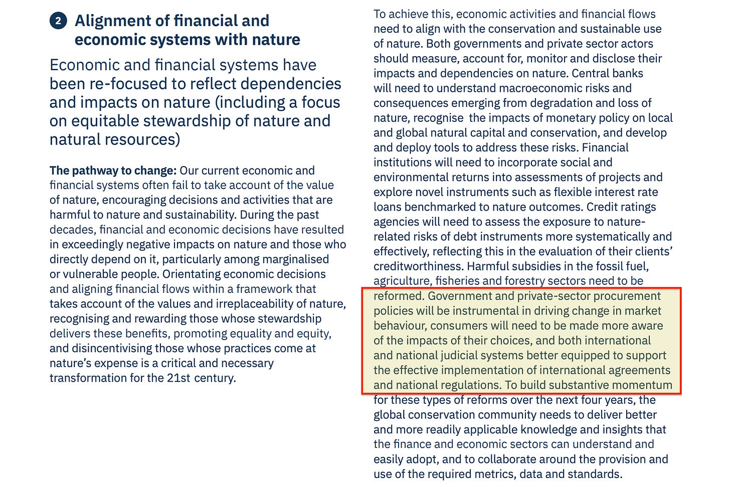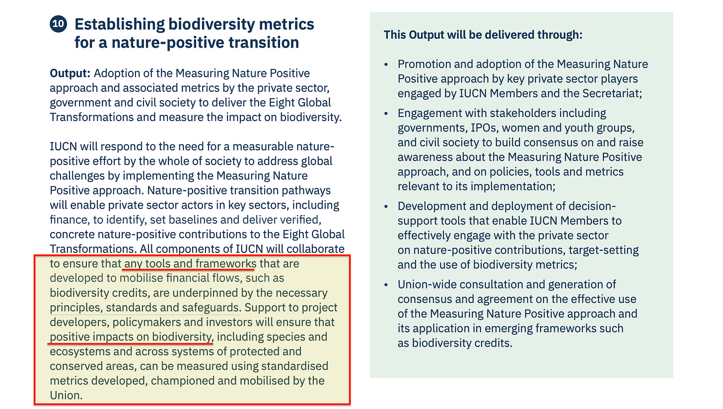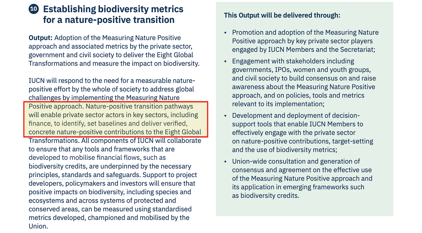 The Programme is explicit about this, describing ‘Government and private-sector procurement policies’ as instruments for ‘driving change in market behaviour’. The rails of ordinary economic life get wired to nature-related criteria as defined by IUCN’s indicator frameworks.
