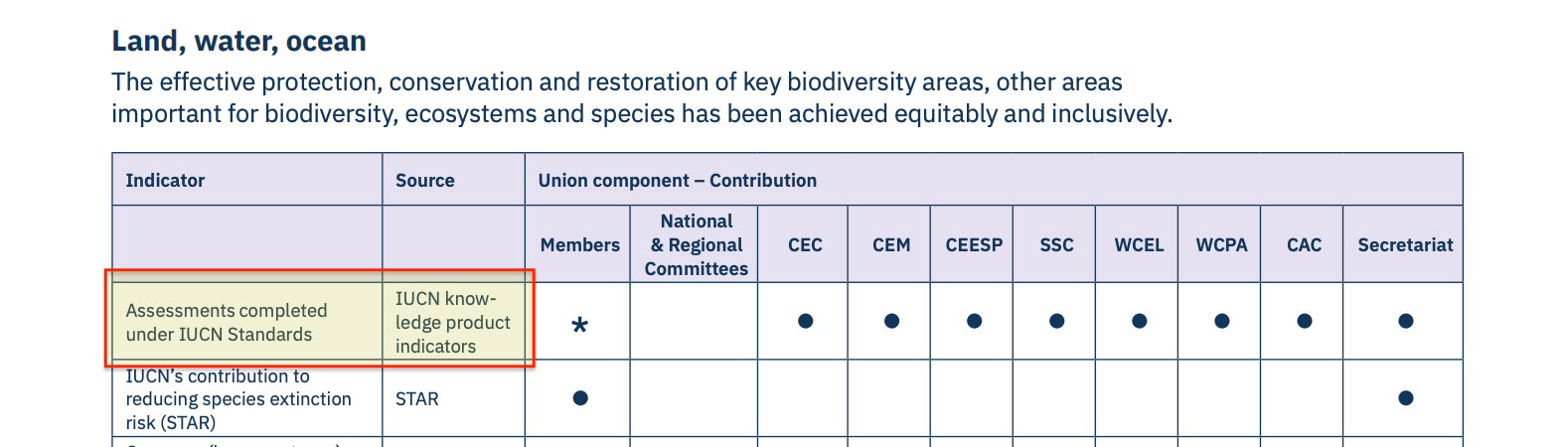 The mechanism works through certification. IUCN standards create assessable, certifiable objects: a Key Biodiversity Area7, a threat category8, a ‘nature-positive’ performance rating9. The Programme explicitly tracks ‘Assessments completed under IUCN Standards’ as a core indicator of success.