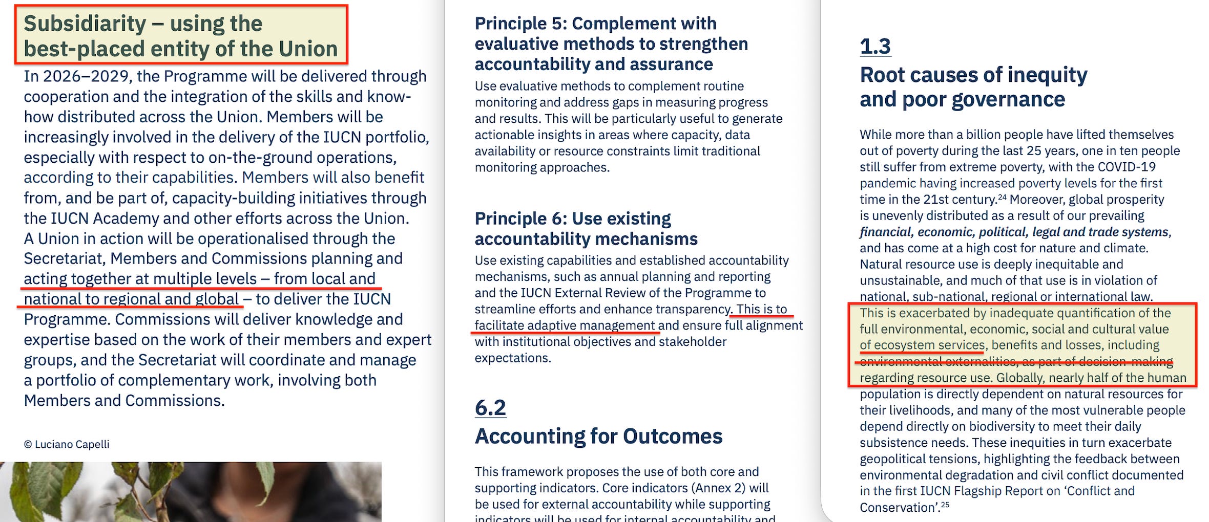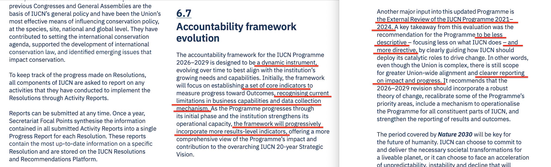 The Programme includes an accountability framework with multiple layers: accounting for Outcomes, Outputs, ‘catalytic roles’, Resolutions and Recommendations, and ‘contributions to nature’.