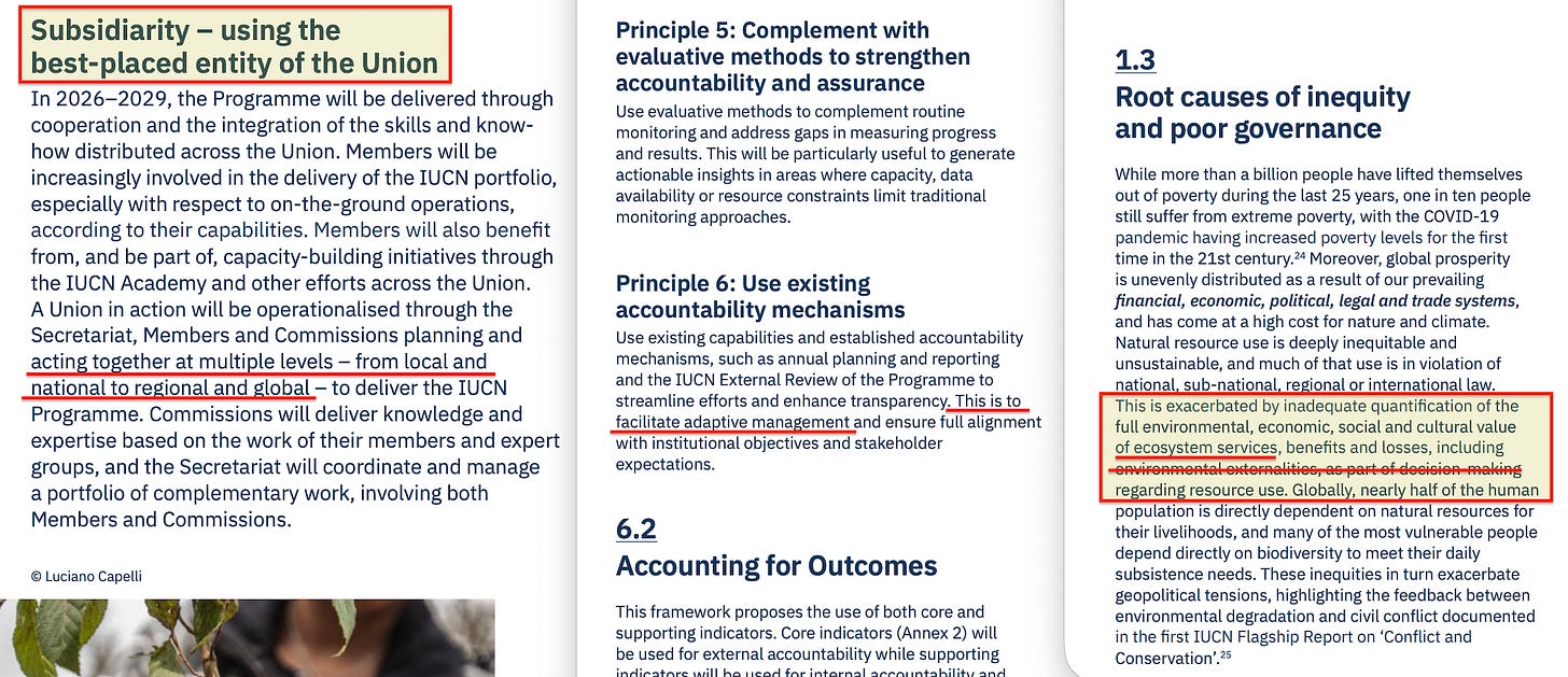 Why would sovereign nations and global corporations accept such a framework? The Programme answers this directly, describing itself as responding to ‘unprecedented planetary crises’ including ‘biodiversity loss, the climate emergency and pandemics’. It frames IUCN as operating at ‘the nexus of knowledge, policy and action’ to address ‘interlinked global crises’ that can only be managed ‘by working together as a Union’.
