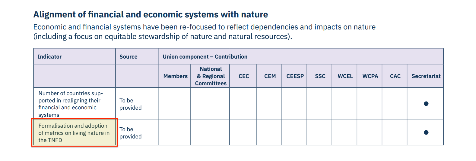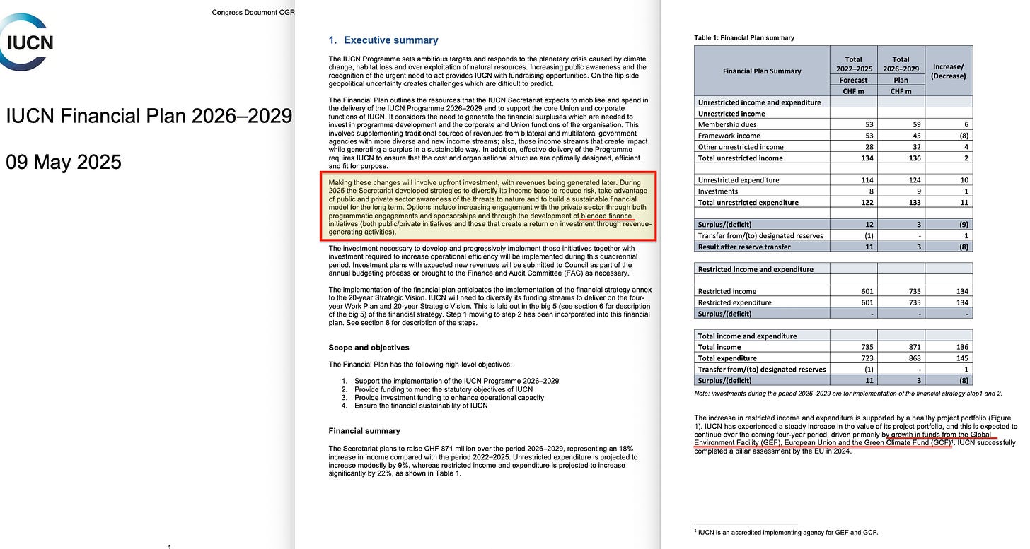 The first is financial. Central banks are named as integration targets for ‘nature-related risks’. Credit rating agencies are expected to assess exposure ‘more systematically’. Procurement policies are positioned as market-behaviour drivers. The associated Financial Plan18 introduces a KPI regime monitored by the Finance and Audit Committee, explicitly linking financial oversight to the Programme’s core indicators, while also proposing ‘blended finance initiatives’ and noting IUCN’s accredited implementing role for GEF/GCF.