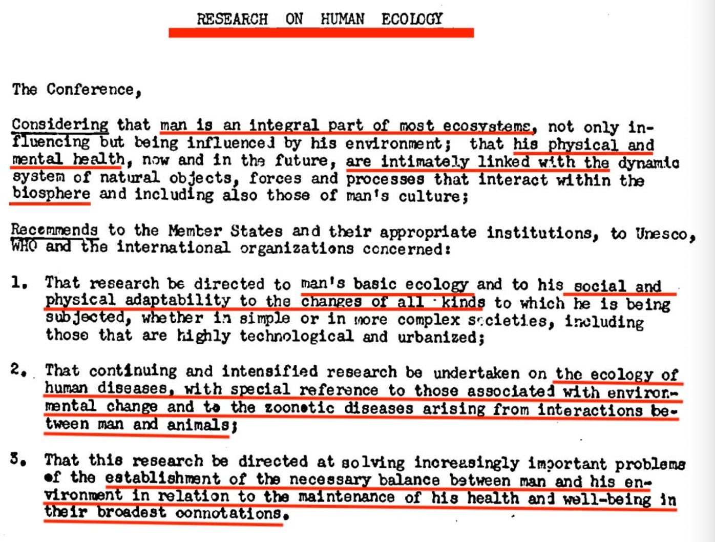 In September 1968, UNESCO convened the Intergovernmental Conference on the Scientific Basis for Rational Use and Conservation of the Resources of the Biosphere in Paris22. The conference produced twenty recommendations. Recommendation 3.2 called for ‘continuing and intensified research on the ecology of human diseases, with special reference to those associated with environmental change and to the zoonotic diseases arising from interactions between man and animals’.