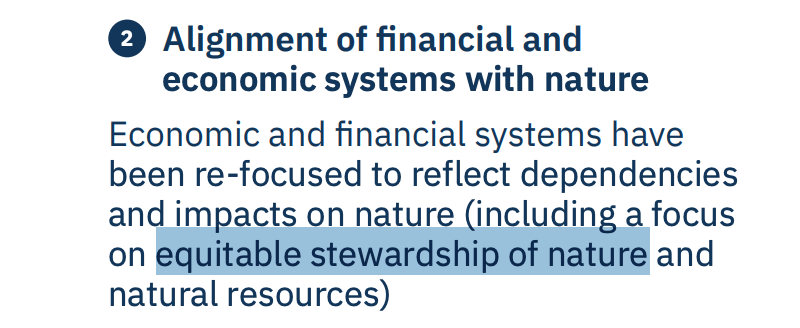 The Programme uses the word ‘stewardship’ repeatedly. Indigenous peoples and local communities are described as ‘natural resource stewards’. The financial transformation is framed as promoting ‘equitable stewardship of nature’.