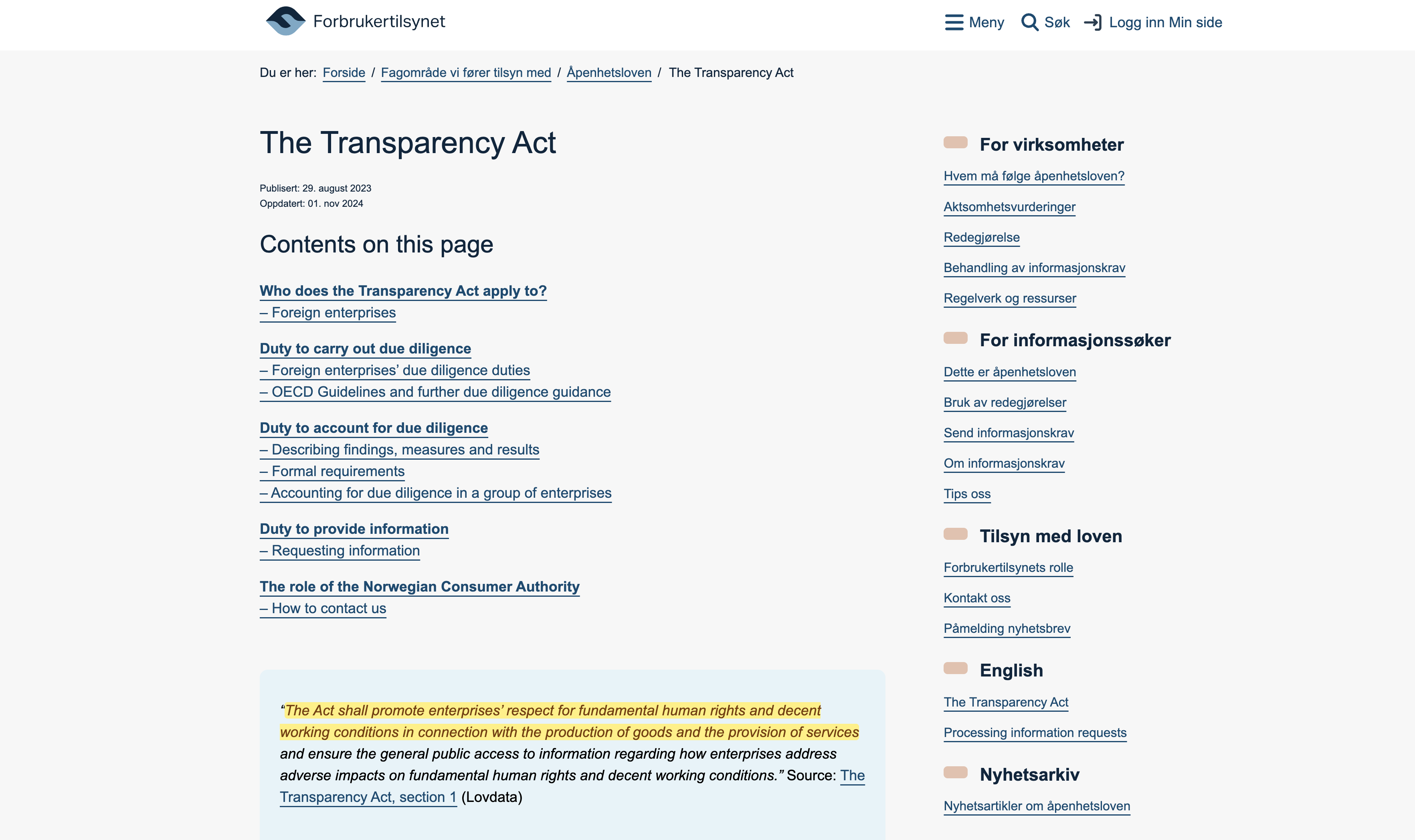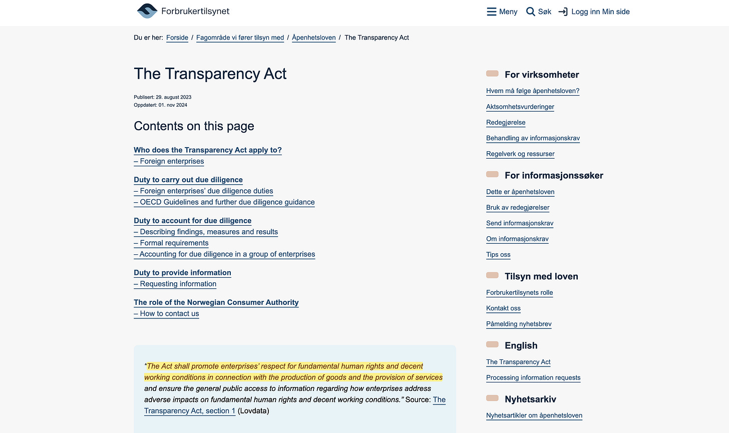 Norway's Transparency Act10 (2022): Requires companies to conduct due diligence on actual and potential adverse impacts on fundamental human rights and decent working conditions. Companies must publish annual transparency reports and respond to public information requests about specific supply chain practices.