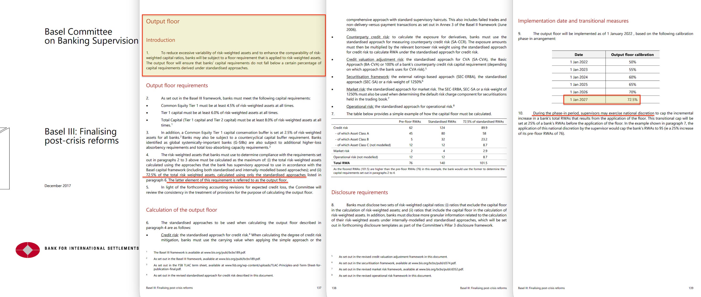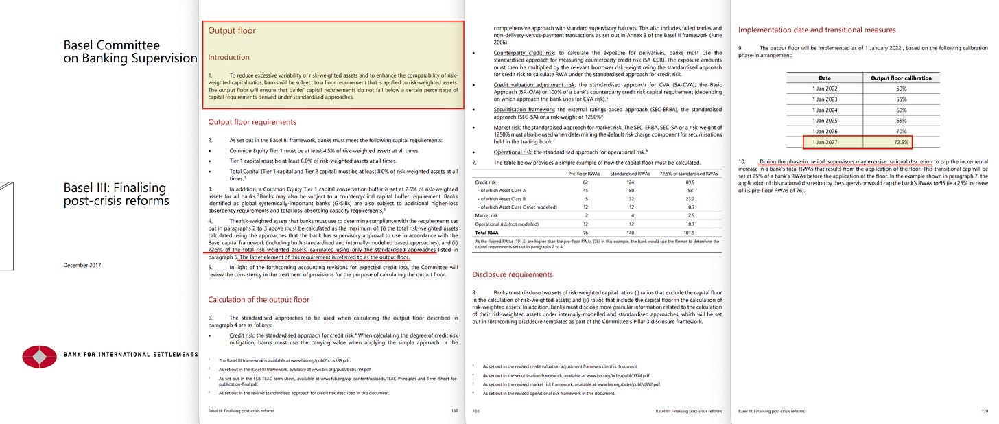 Regulators supposedly grew concerned that banks were gaming these models to minimise requirements. Basel 3.1 addresses this by mandating standardised calculations. The ‘output floor’ requires that capital requirements cannot fall below 72.5 percent of what the standardised approach would produce3. For several major asset classes, internal models have been eliminated entirely.