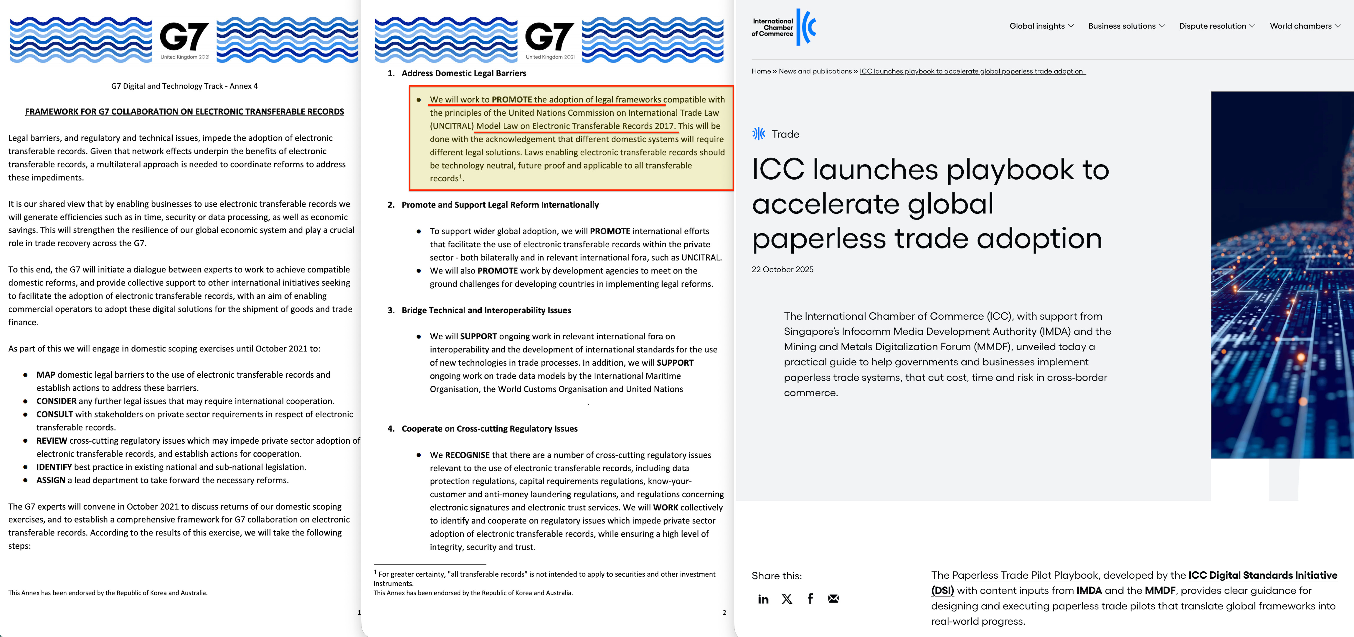 The International Chamber of Commerce, through its Digital Standards Initiative32, has become the main promoter of MLETR adoption worldwide33. The G7 endorsed the Model Law at Carbis Bay in 202134. The United Kingdom passed it into law through the Electronic Trade Documents Act 202335. Singapore amended its Electronic Transactions Act in 202136. France, Germany, and Japan have legislation in the works. The ICC runs adoption programmes in dozens of countries across Africa, Asia, the Caribbean, and the Pacific37.