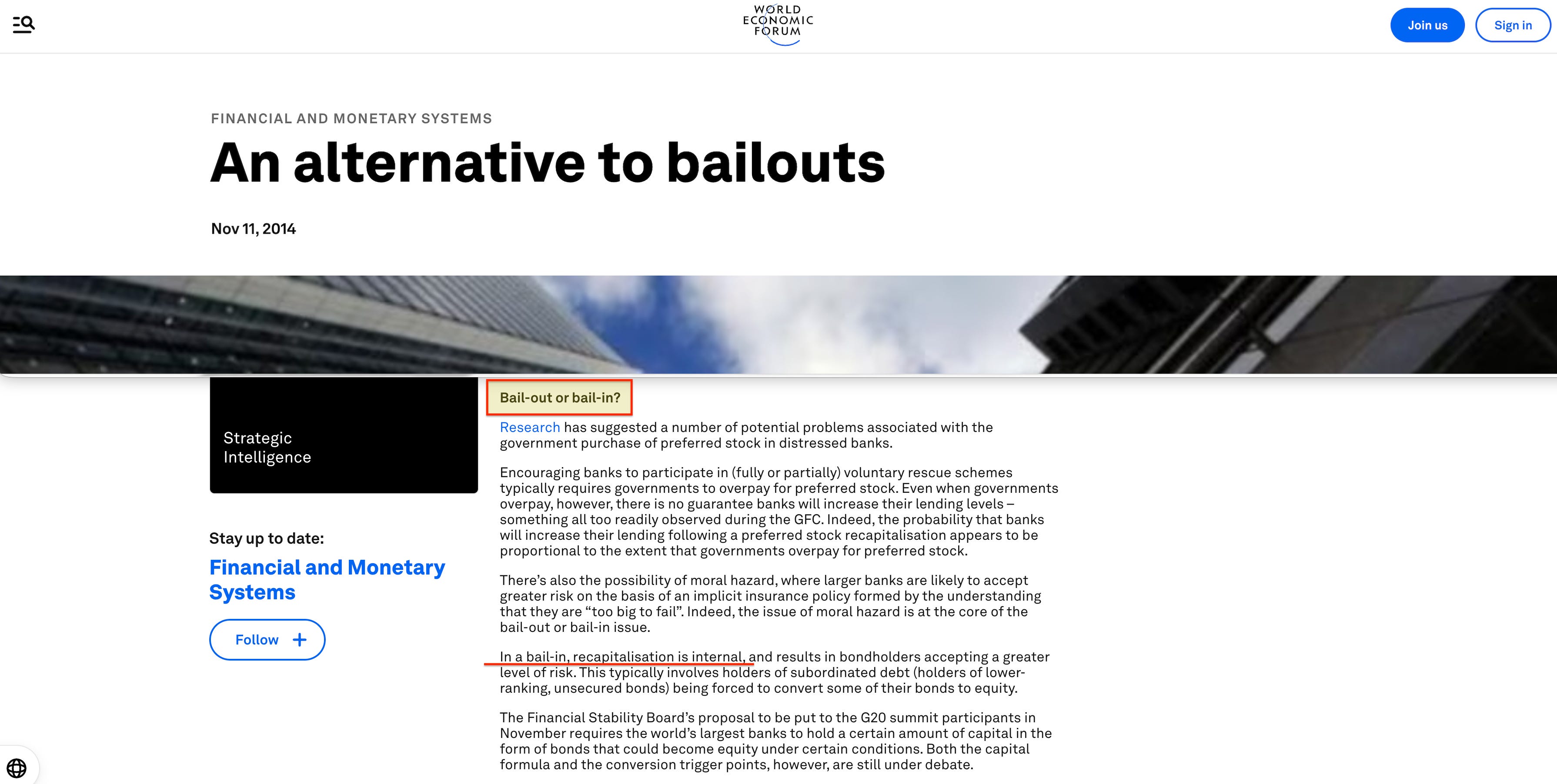 After the 2008 financial crisis6, the G20 decided that taxpayer-funded bailouts had become politically toxic7. The alternative they chose was the bail-in8: instead of injecting public money to save a bank, authorities would recapitalise the failing institution by imposing losses on its shareholders and creditors.