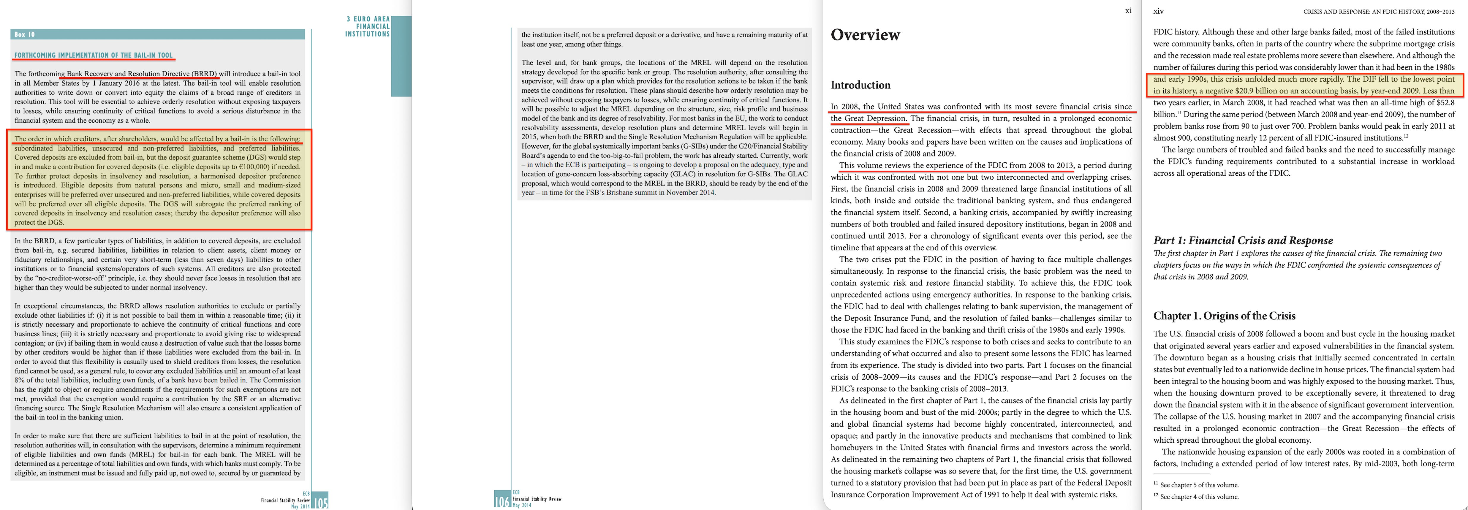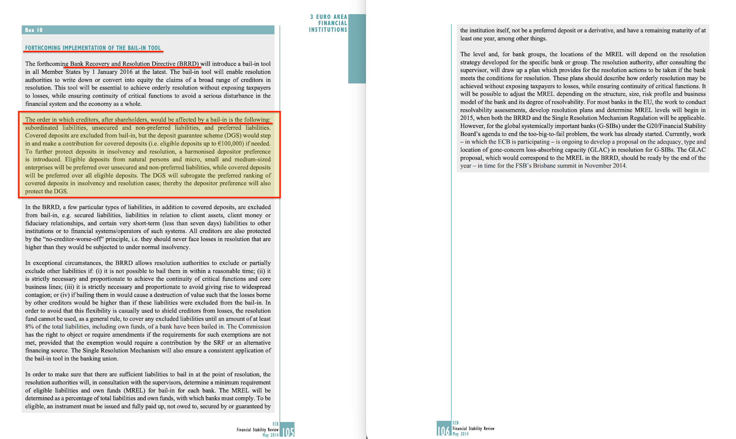 A joint paper published by the FDIC and the Bank of England in 2012, titled ‘Resolving Globally Active, Systemically Important Financial Institutions’13, put it plainly: losses would fall on shareholders and unsecured creditors.