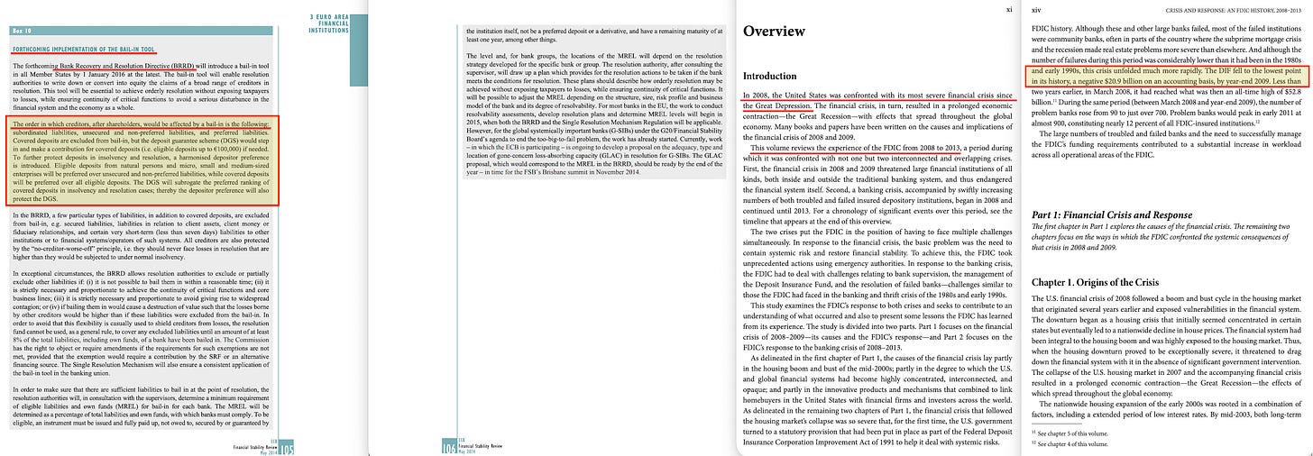 Post-2008 (resolution regimes): authorities get the power to restructure banks over a weekend; covered deposits are protected up to the cap, uninsured balances sit in the hierarchy.