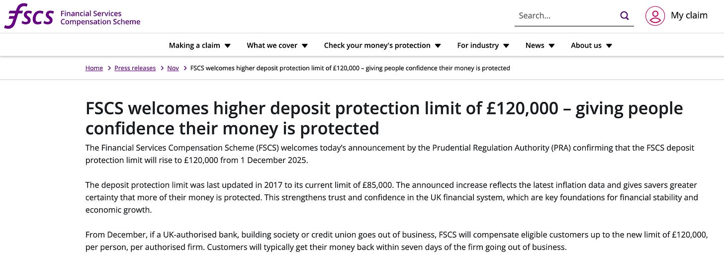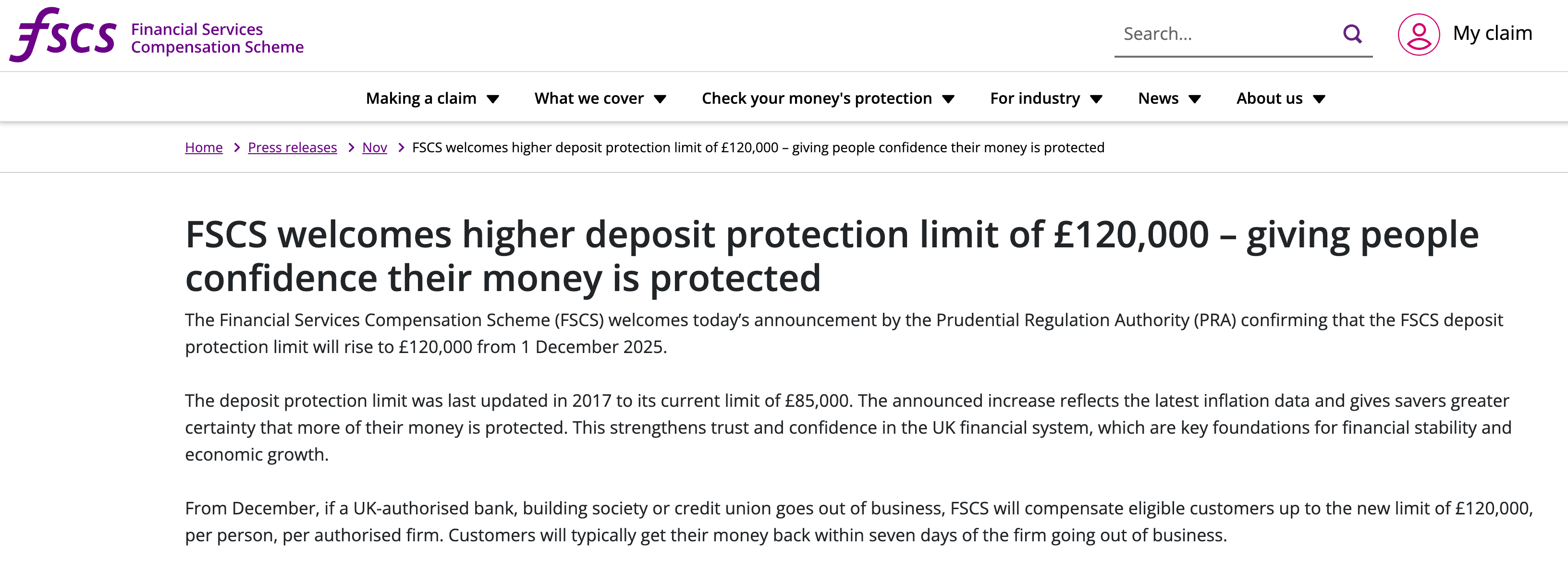Depositors are unsecured creditors of the bank. In the UK, the FSCS covers deposits only up to £120,000 per eligible person per authorised firm14; balances above that cap are uninsured and therefore exposed to loss.