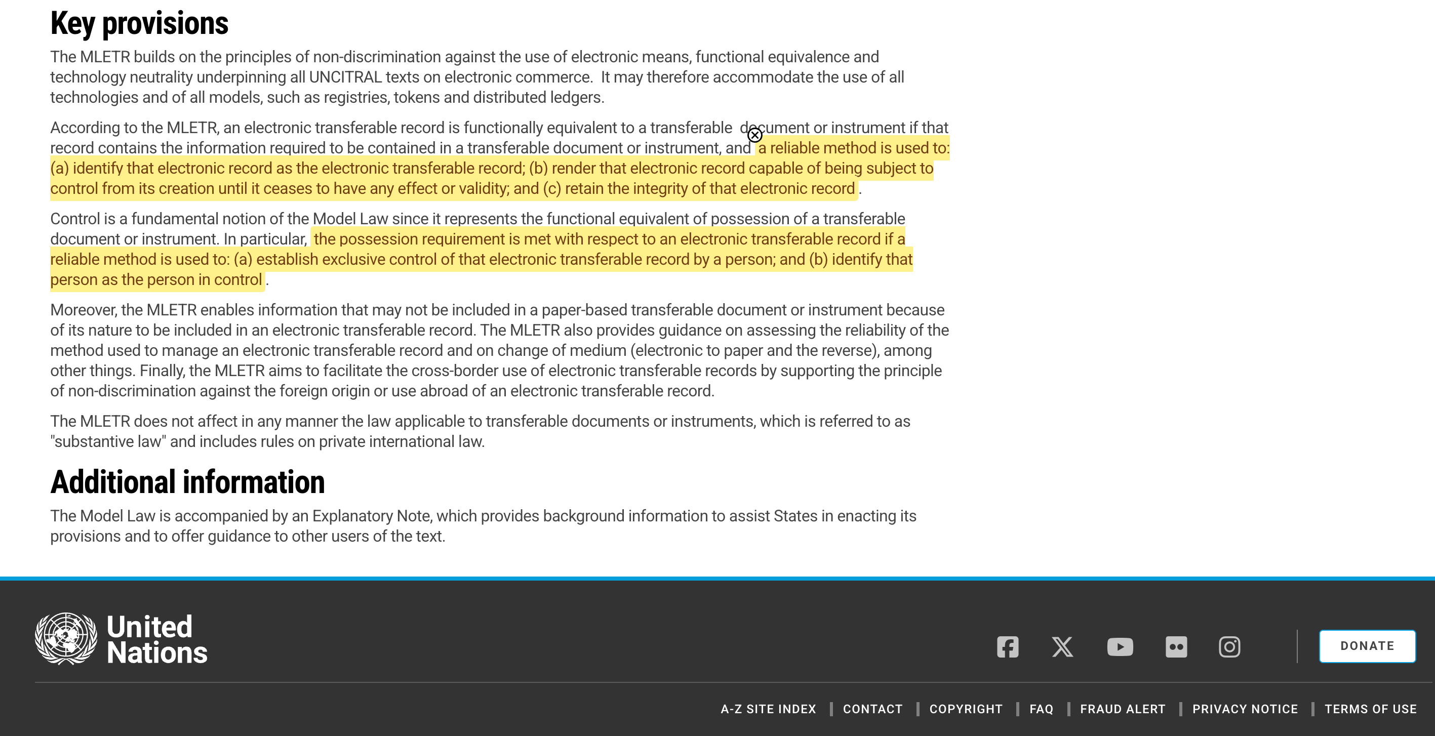 MLETR takes the control concept from American commercial law and makes it the global standard for electronic trade documents and transferable records. Under the Model Law, an electronic record counts as legally equivalent to a paper document only if a ‘reliable method’ shows that an identifiable person has exclusive control.