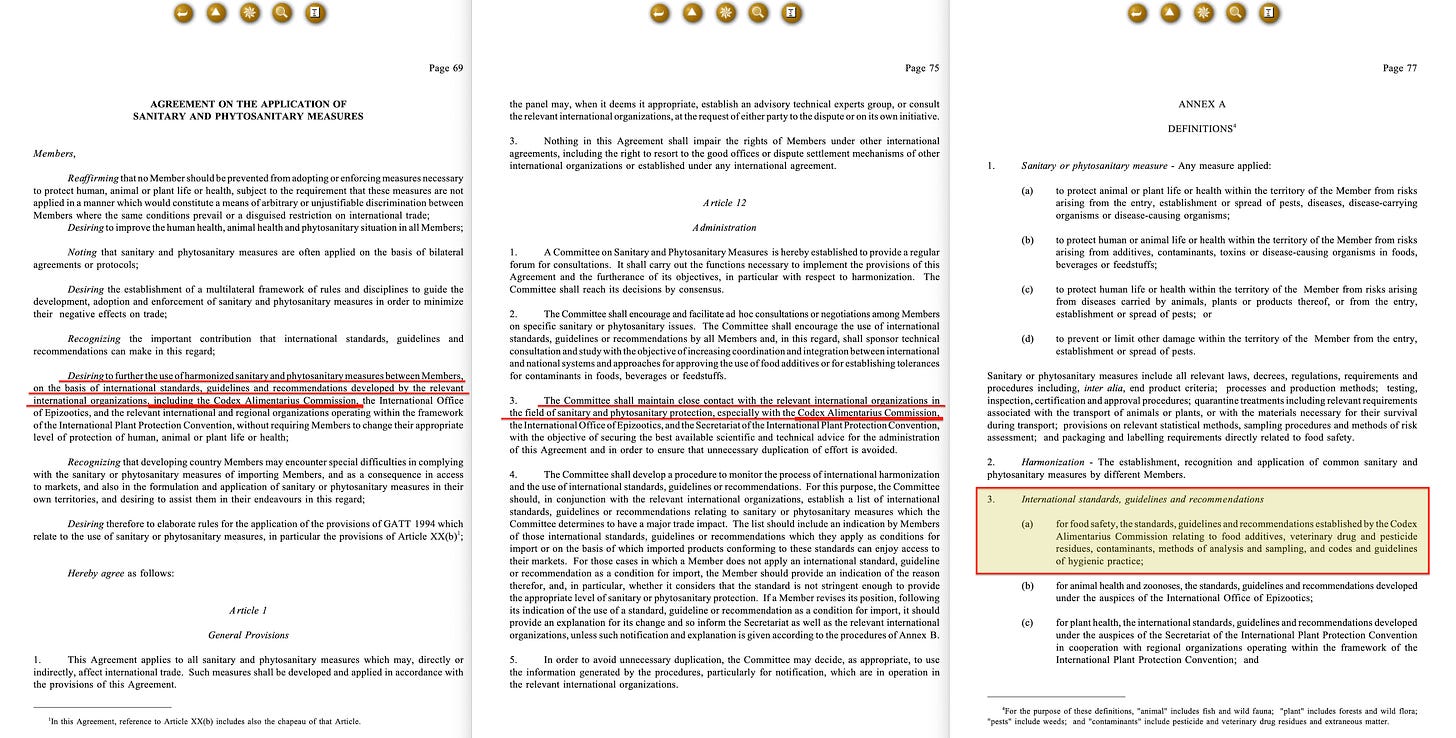 The hard enforcement channel runs through the Codex Alimentarius Commission2, established jointly by the FAO and the World Health Organisation in 1963. Codex develops standards covering pesticide residue limits3, food additives4, and labelling requirements5. These standards are formally voluntary, but when the World Trade Organisation was established in 19956, its Agreement on Sanitary and Phytosanitary Measures7 designated Codex as the reference standard for food safety disputes. If your country’s regulations differ from Codex standards and a trading partner challenges them, the burden falls on you to prove your rules are scientifically justified. Failure authorises trade sanctions.