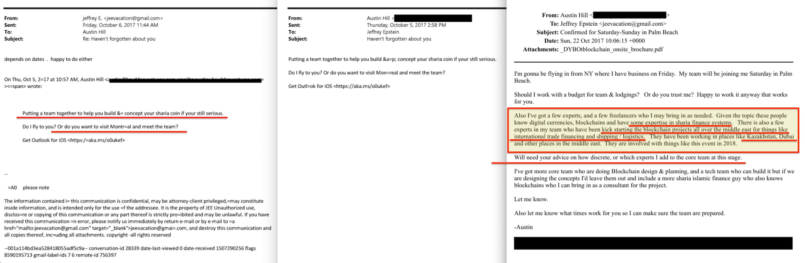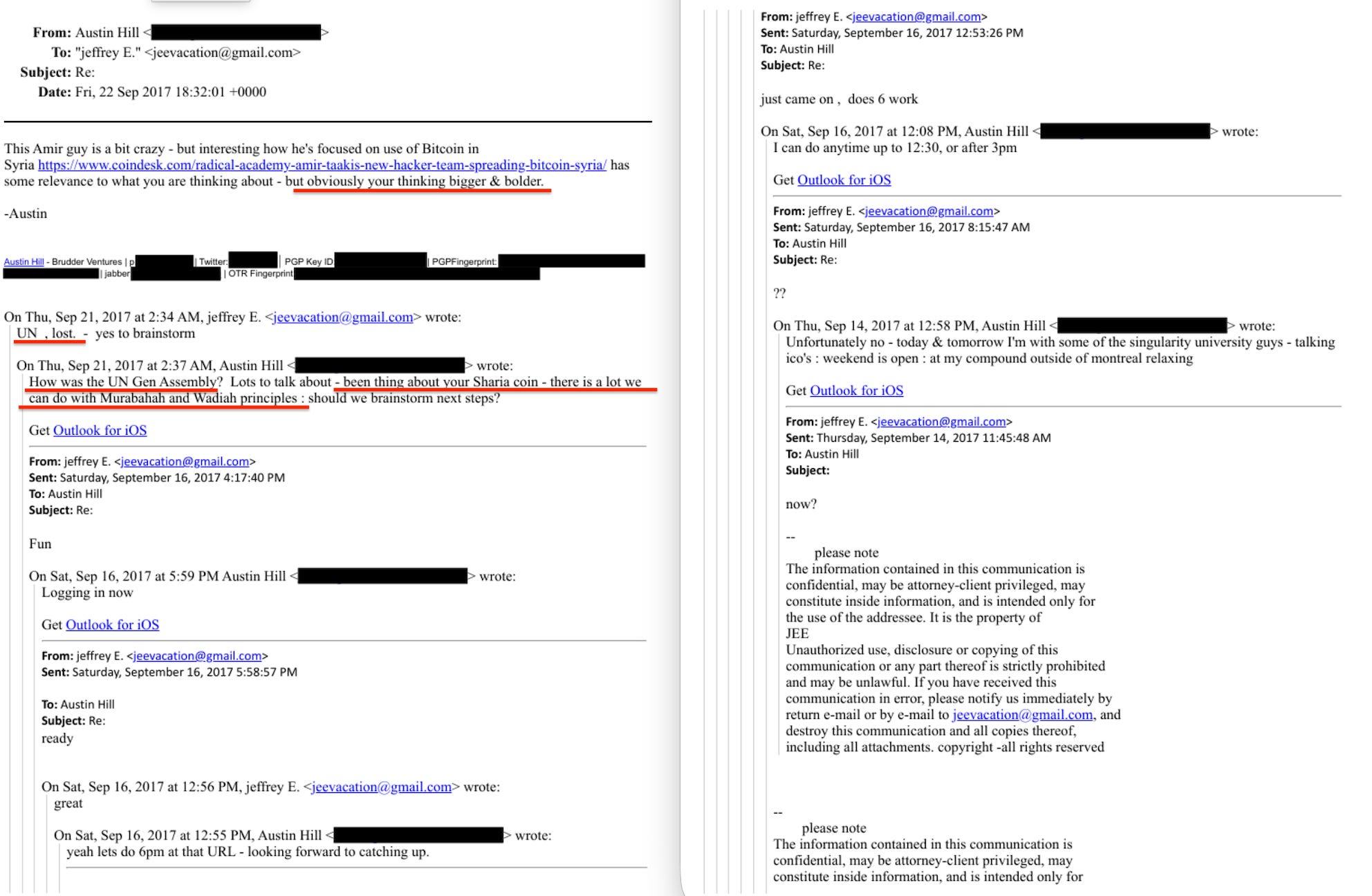 ‘Lots to talk about - been [thinking] about your Sharia coin’, Hill wrote to Epstein in September 2017. ‘There is a lot we can do with Murabahah and Wadiah principles: should we brainstorm next steps?’47 Murabahah is cost-plus financing48; Wadiah is safekeeping49. Hill was translating Islamic finance requirements into cryptocurrency architecture.