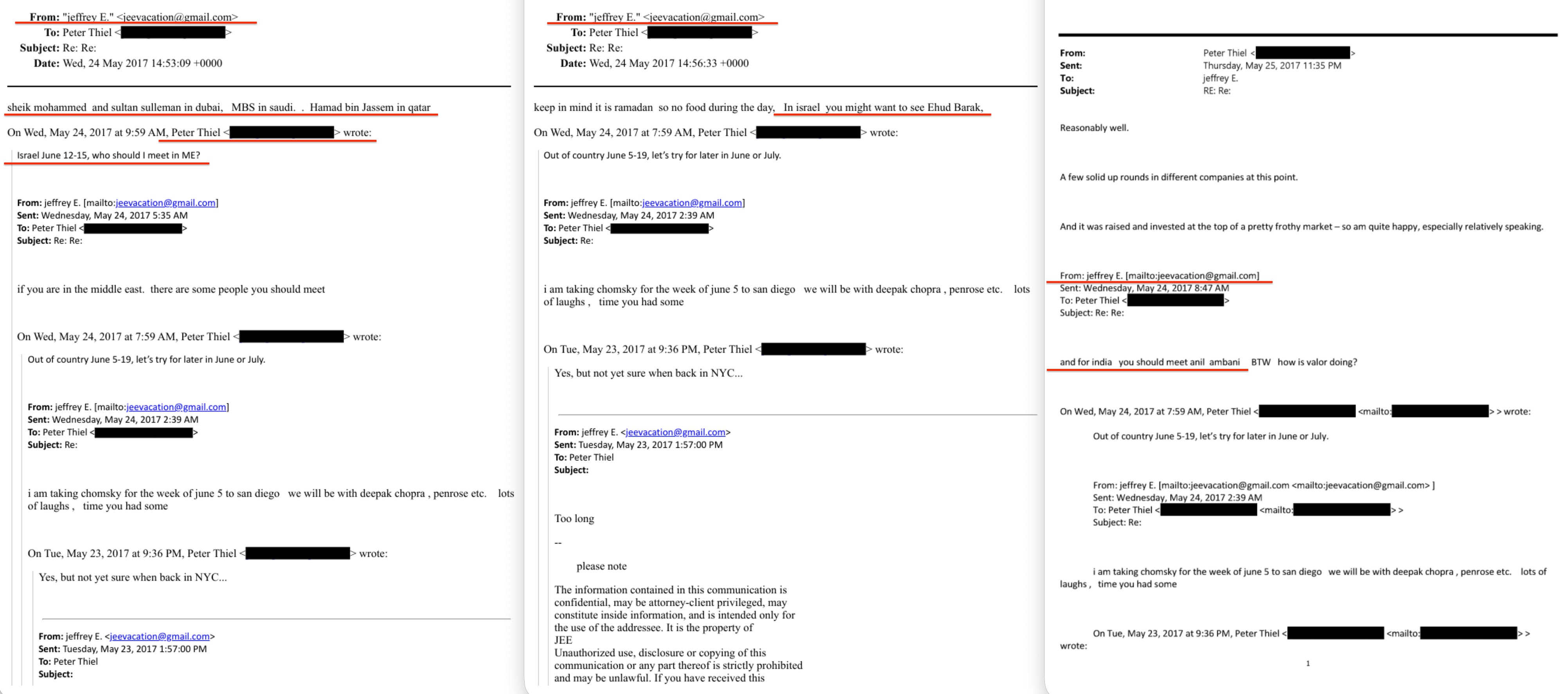 Peter Thiel’s relationship with Epstein began at least by 2012. By April 2016, Epstein was telling him that Summers was ‘on board’ to ‘join with us in concocting a plan’ for digital currency64. In May 2017656667, Thiel told Epstein he would be in Israel June 12-15 and asked: ‘who should I meet in ME?’ Epstein gave him the full sovereign routing: ‘sheik mohammed and sultan sulleman in dubai, MBS in saudi.. Hamad bin Jassem in qatar’. For Israel: ‘you might want to see Ehud Barak’. For India: ‘you should meet anil ambani’.