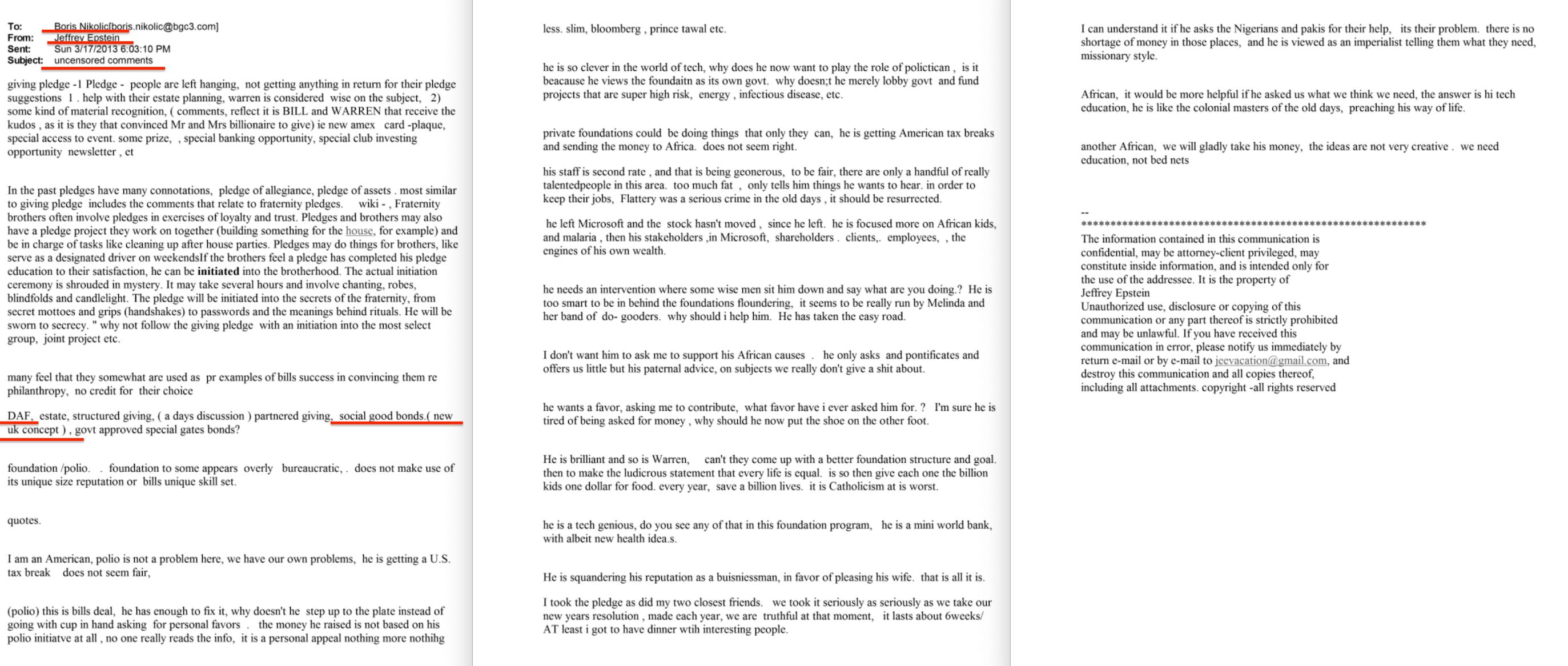 As documented in ‘Epstein’, Epstein had spent 2011 designing the impact investing vehicle with JPMorgan in which capital flows toward measurable social outcomes. In March 2013, weeks before the Branson email, he sent Boris Nikolic a strategic memo listing the components22: ‘DAF, estate, structured giving, (a days discussion) partnered giving, social good bonds. (new uk concept), govt approved special gates bonds?’ He was tracking the UK’s pioneering social impact bond programme and proposing a government-endorsed bond instrument branded to Gates.