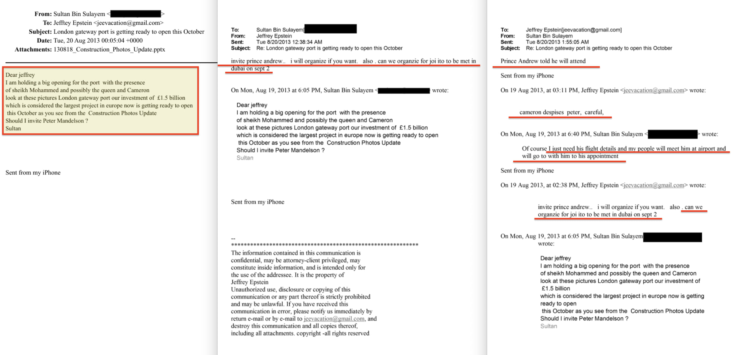 The sovereign deployment targets were being prepared years before the formal pitches. On August 19, 2013 — nine days after the India pilot success report — Bin Sulayem emailed Epstein about the opening of London Gateway, DP World’s £1.5 billion port: ‘I am holding a big opening for the port with the presence of sheikh Mohammed and possibly the queen and Cameron... Should I invite Peter Mandelson?’39 Epstein replied with two deployments in a single sentence: ‘invite prince andrew.. i will organize if you want. also. can we organize for joi ito to be met in dubai on sept 2’.