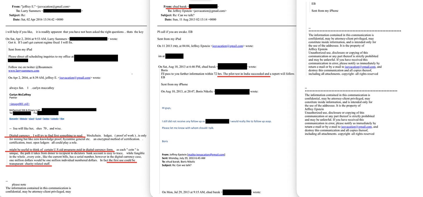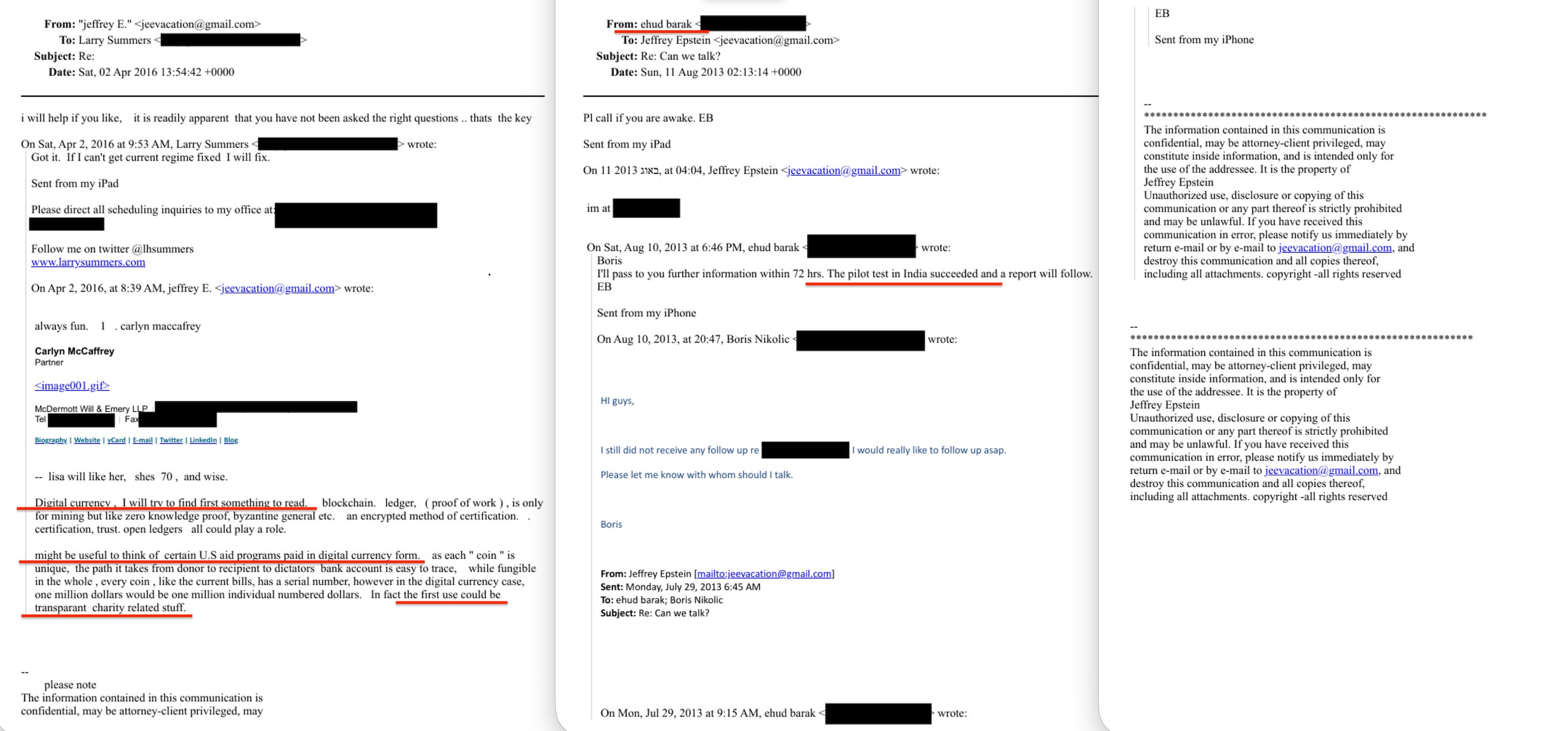 Three years later, in April 2016, Epstein sent Summers the tokenisation specification and made the deployment strategy explicit. Each digital coin would carry a unique serial number. Every transaction would be traceable from issuance to endpoint. And the entry vector23: ‘the first use could be transparant charity related stuff’.
