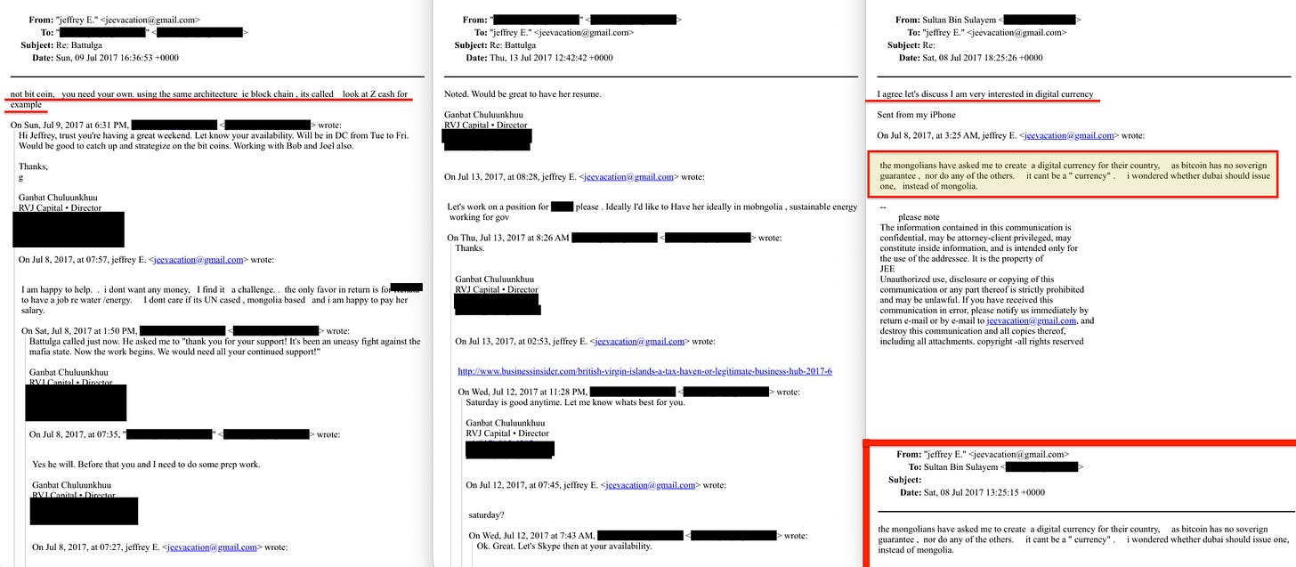 Over the following days, Epstein educated Ganbat on the technical architecture. ‘Not bit coin, you need your own. using the same architecture ie block chain... look at Z cash for example’35. The core argument36: ‘if mongolia would issue a new coin it would be the first real currency.... as a real currency MUST be backed by a sovereign’. He proposed beginning when the president arrived for the UN General Assembly in September — the same session where Miroslav Lajčák, a diplomat in regular correspondence with Epstein, was serving as President.