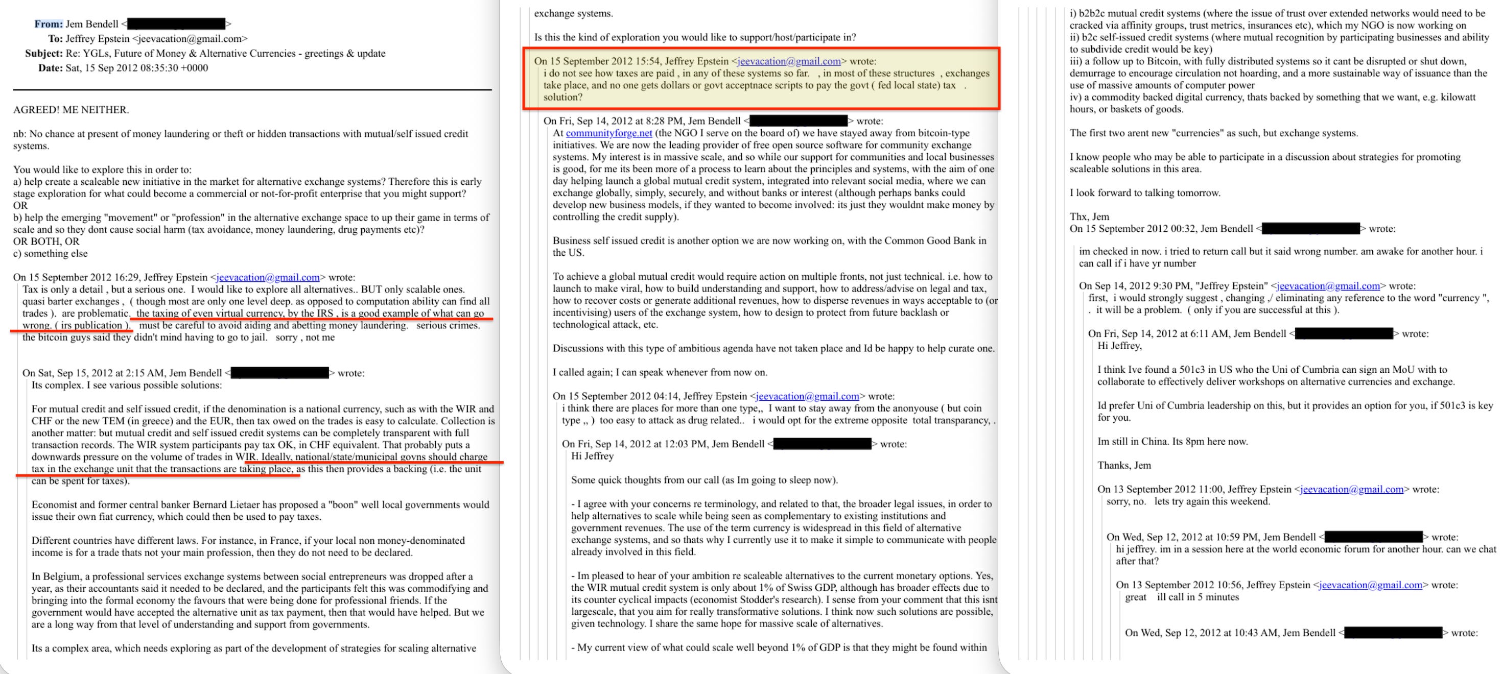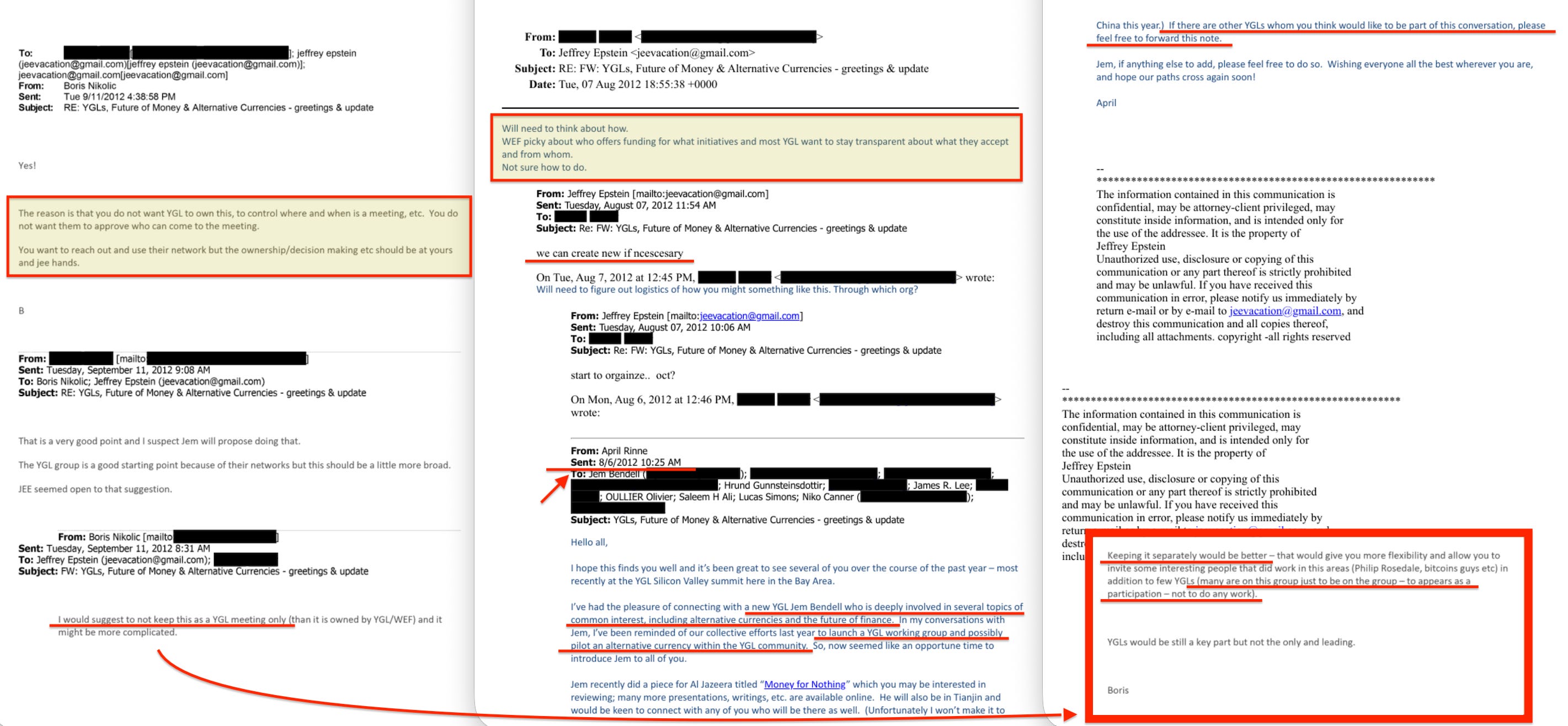 The WEF’s Alternative Currencies initiative had a structural limitation, and in August 2012 someone spelled it out for Epstein. ‘Will need to think about how’, the email began7. ‘WEF picky about who offers funding for what initiatives and most YGL want to stay transparent about what they accept and from whom. Not sure how to do’.