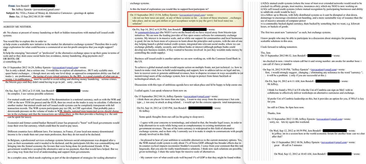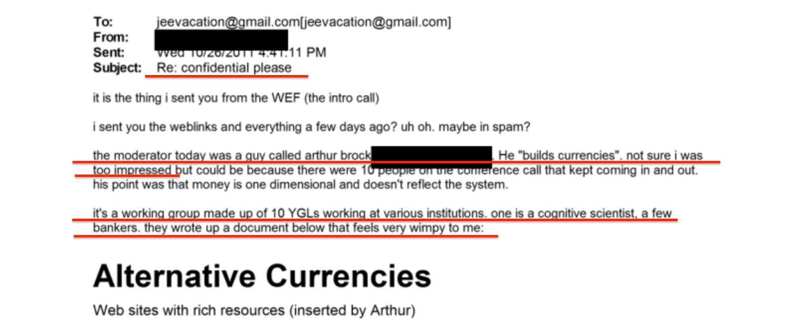 The operation began in October 2011, when someone inside the WEF’s Alternative Currencies working group sent Epstein a report on the introductory call. ‘The moderator today was a guy called arthur brock’, the email read2. ‘He ‘builds currencies’. not sure i was too impressed’. The working group comprised ten Young Global Leaders — ‘one is a cognitive scientist, a few bankers’ — and had produced a document the correspondent found wanting. ‘It feels very wimpy to me’.