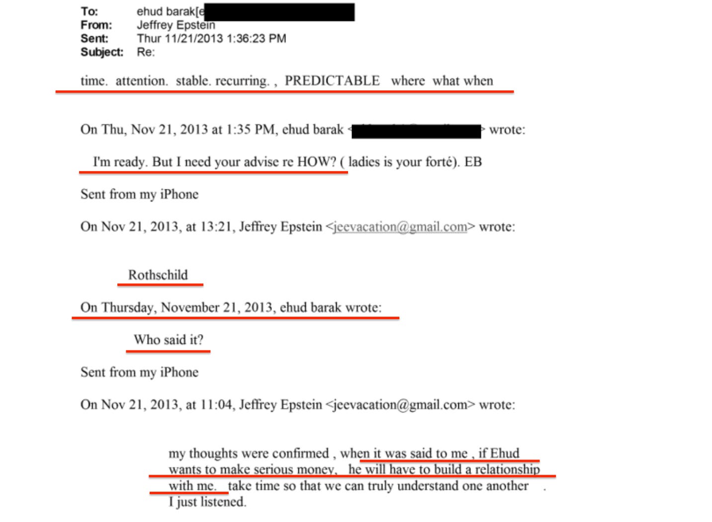 The financial architecture was assembled in parallel. Documents from November 2013 show Epstein coaching Barak on how to cultivate Ariane de Rothschild — head of the Edmond de Rothschild Group — instructing him to be ‘stable, recurring, PREDICTABLE’89 and comparing his monetisable value to that of former CIA director Michael Hayden and former NSA director Keith Alexander: intelligence credentials converted to capital.