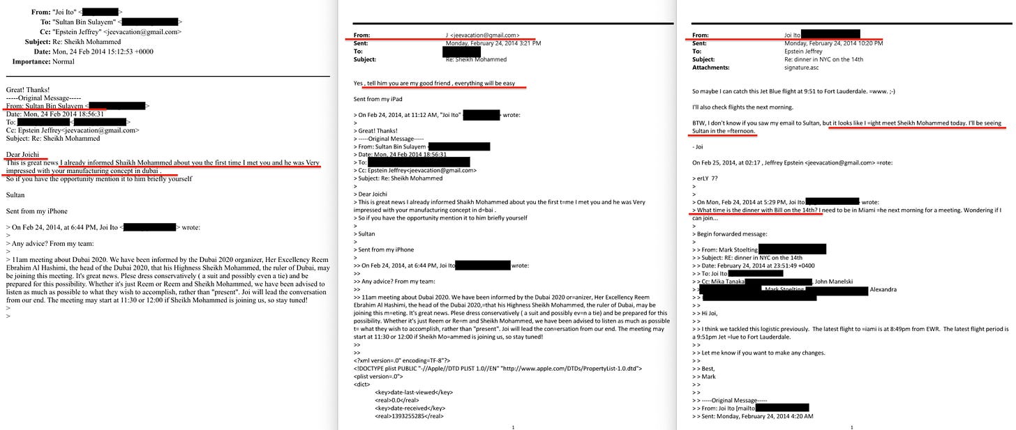 Six months later, the introduction bore results. On February 24, 2014, Bin Sulayem emailed Joi Ito, cc: Epstein, reporting that he had already told Sheikh Mohammed about Ito’s ‘manufacturing concept in Dubai’ and that the ruler was ‘Very impressed’41. Ito asked Bin Sulayem for advice before the meeting. Epstein, from above: ‘Yes, tell him you are my good friend, everything will be easy’42. That evening, Ito reported back to Epstein43: ‘it looks like I might meet Sheikh Mohammed today. I’ll be seeing Sultan in the afternoon’. In the same thread, he asked: ‘What time is the dinner with Bill on the 14th?’ The code builder, the sovereign client, and the technology-identity funder — all routed through the switchboard on a single day.