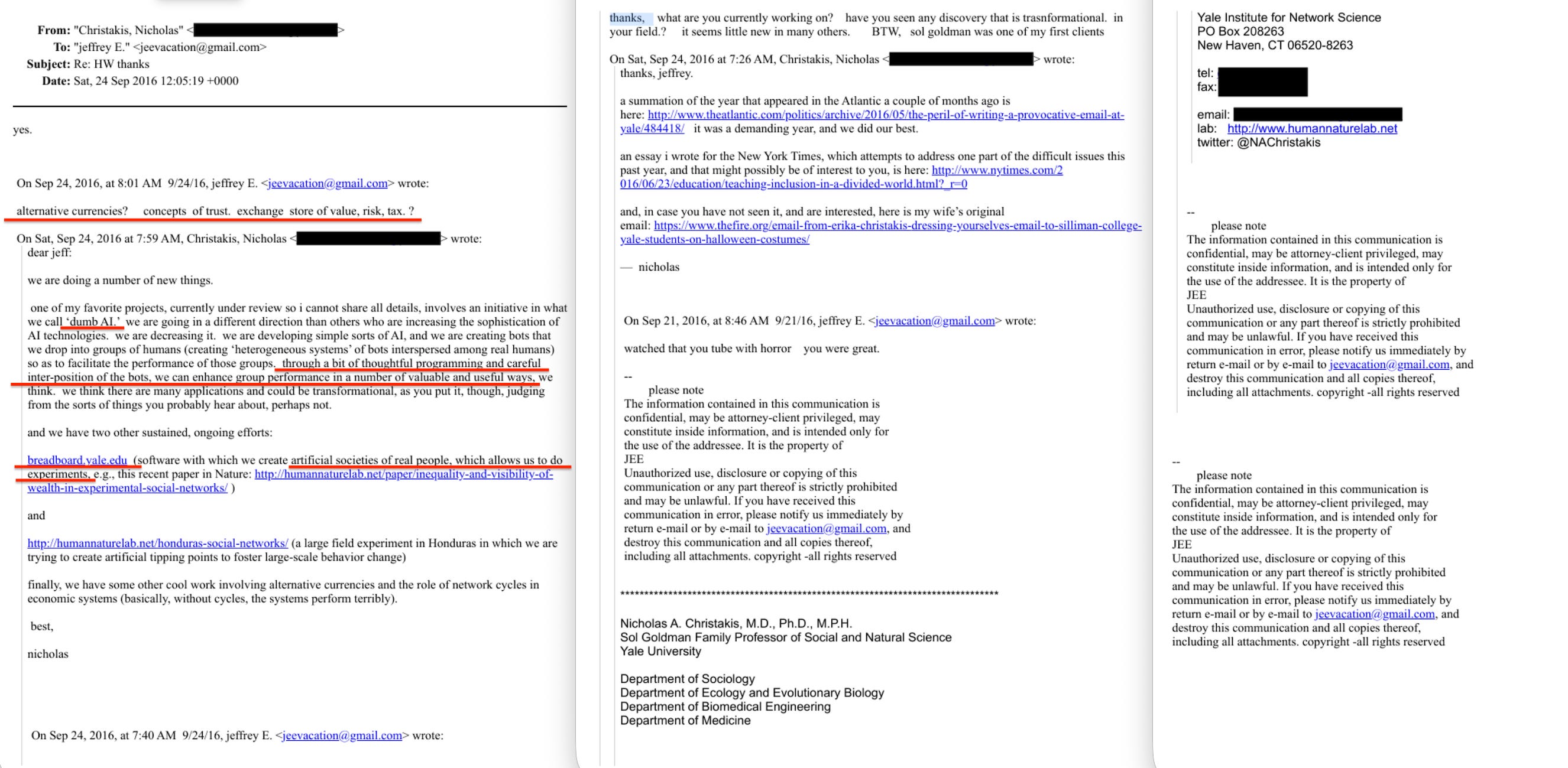 In September 2016, Epstein posed questions to Nicholas Christakis, the Yale network scientist56: ‘alternative currencies? concepts of trust. exchange store of value, risk, tax.?’