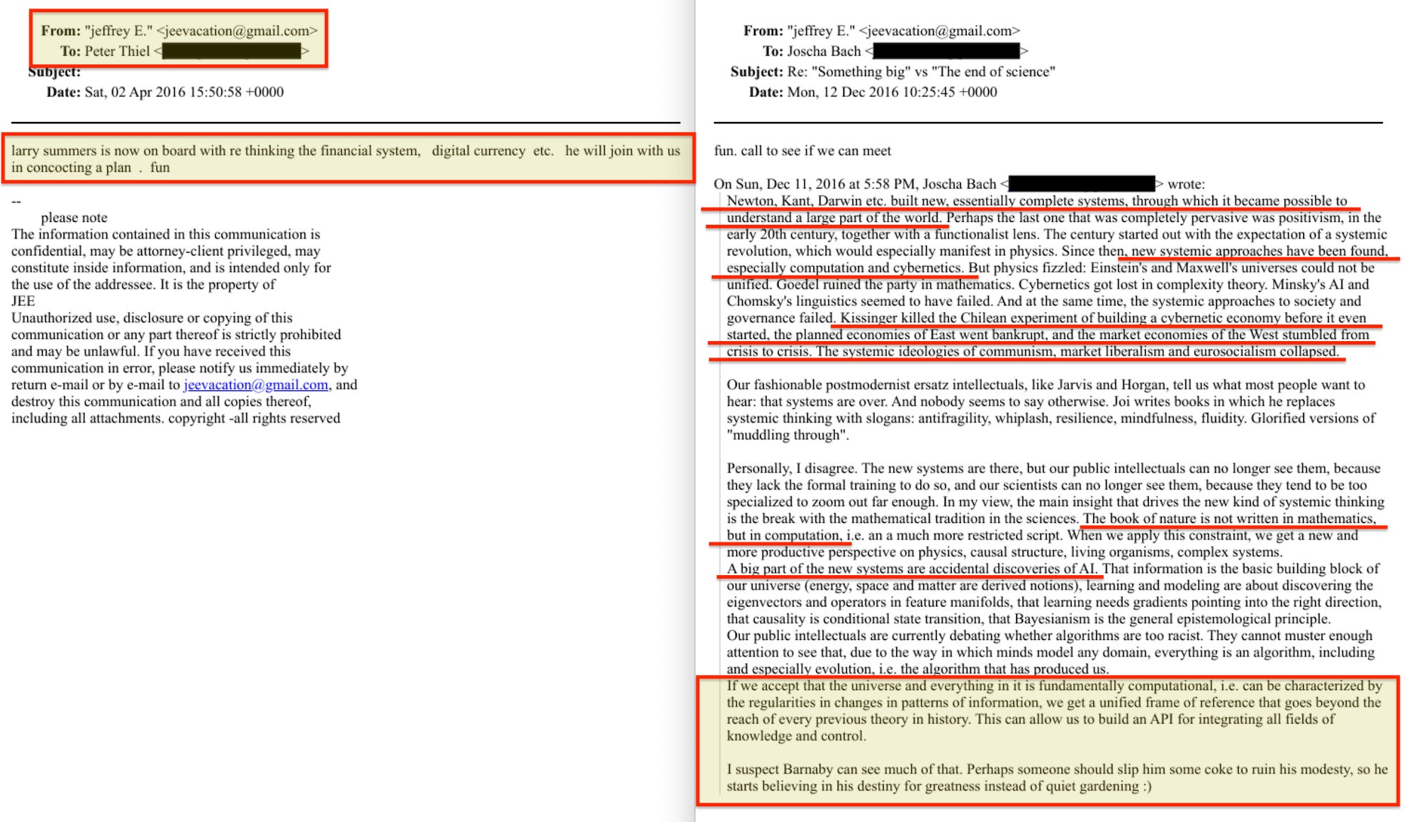 In September 2025, the Treasury Department awarded Thiel’s company Palantir a contract to build a ‘common API layer’ for government systems68. In December 2016, Joscha Bach — whose AI research Epstein funded — had described to Epstein what might replace collapsing institutional frameworks: ‘an API for integrating all fields of knowledge and control’69.