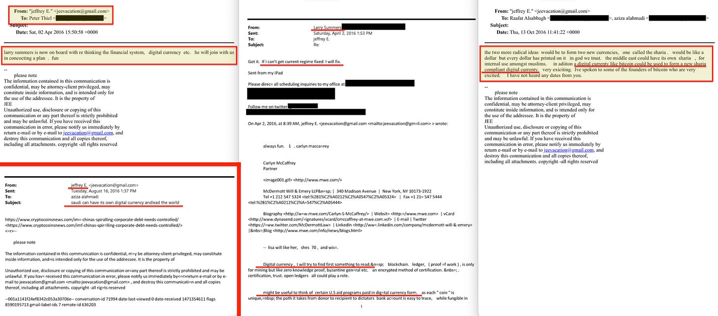 In August 2016, Epstein emailed a Saudi contact29: ‘saudi can have its own digital currency and lead the world’. By October, he had elaborated the proposal into two currencies: a physical ‘Sharia’ currency for internal Muslim use and a Sharia-compliant digital currency modelled on Bitcoin’s architecture. ‘I have spoken to some of the founders of Bitcoin who are very excited’, he wrote30. The concept integrated Islamic finance principles with programmable money.