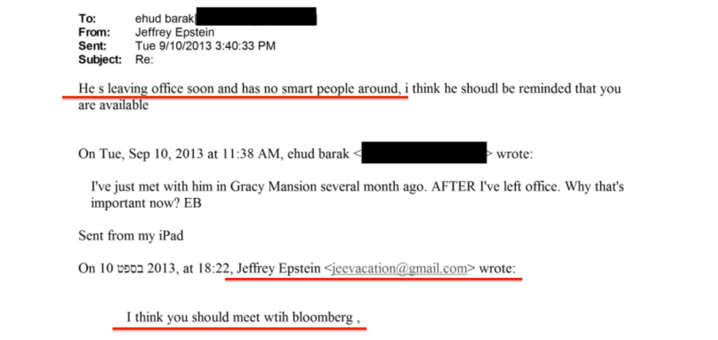 The mechanism by which the SDGs become enforceable was also routed through the network. On September 10, 2013 — during the summit week — Epstein instructed Barak to meet Michael Bloomberg, who was about to leave the New York mayoralty87. Barak resisted: ‘I’ve just met with him in Gracy Mansion several month ago. AFTER I’ve left office. Why that’s important now?’ Epstein: ‘He s leaving office soon and has no smart people around, i think he shoudl be reminded that you are available’.