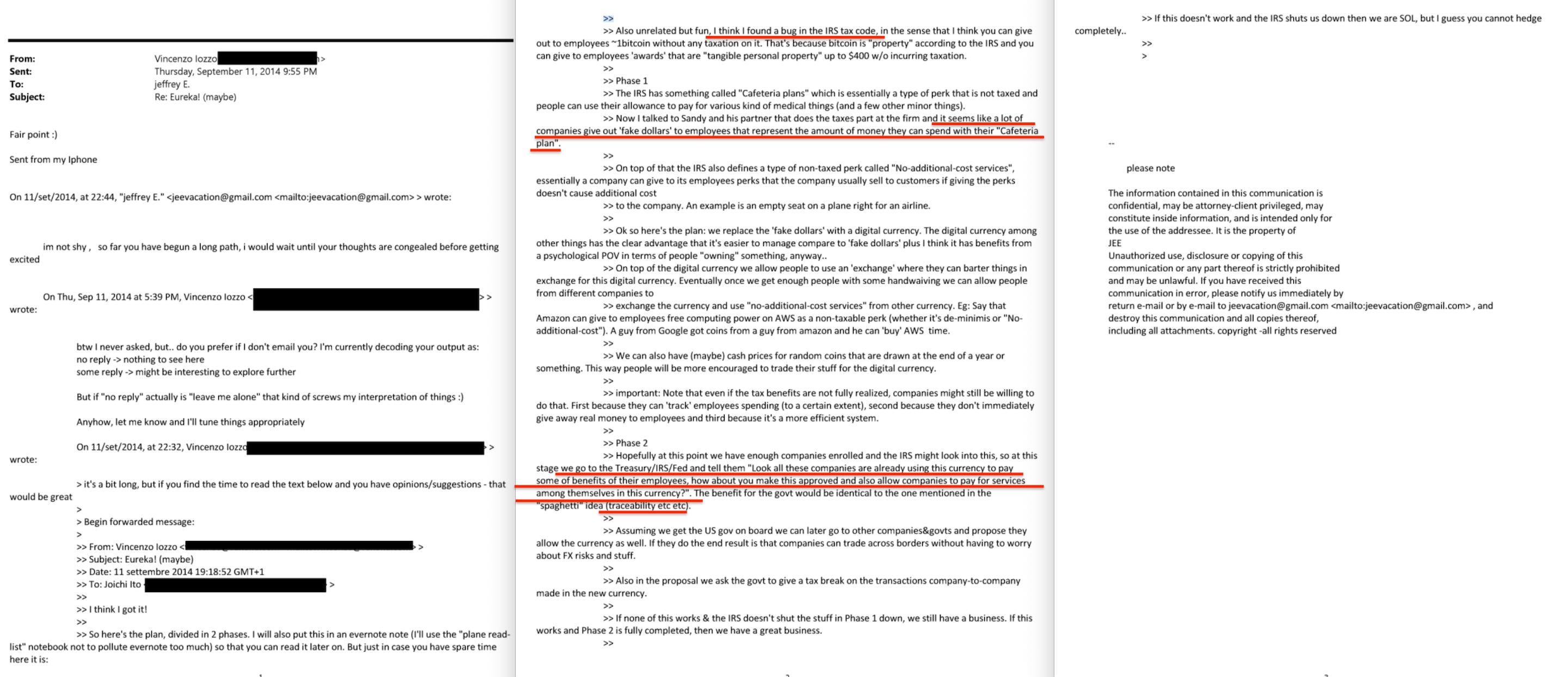 A month later, in September 2014, Vincenzo Iozzo sent Joi Ito a detailed two-phase plan — copied to Epstein — for building a traceable digital currency. Phase 1 would replace corporate ‘fake dollars’ with a digital currency46, build an exchange for employees to barter, then expand to cross-company trading. Phase 2 would leverage adoption to approach regulators: ‘we go to the Treasury/IRS/Fed and tell them ‘Look all these companies are already using this currency to pay some of benefits of their employees, how about you make this approved’’. The explicit benefit to government: ‘traceability etc etc’.