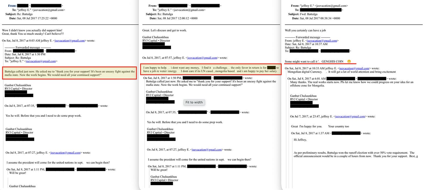 In July 2017, Khaltmaagiin Battulga won the Mongolian presidential election31. Ganbat Chuluunkhuu, a director at RVJ Capital, messaged Epstein with the results32: ‘Battulga called just now. He asked me to ‘thank you for your support! It’s been an uneasy fight against the mafia state. Now the work begins. We would need all your continued support!’
