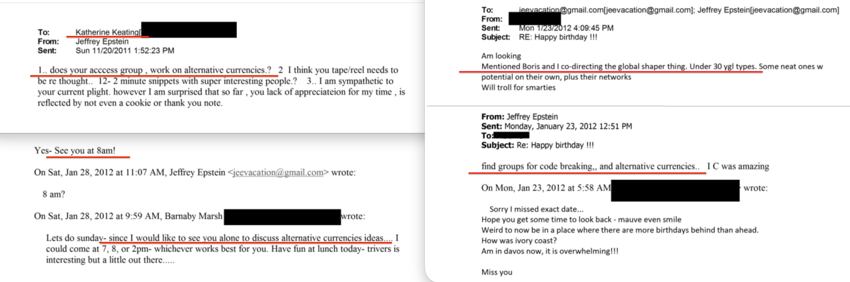 The following month, Epstein emailed Katherine Keating — daughter of former Australian Prime Minister Paul Keating3 — asking whether her ‘access group’ worked on alternative currencies4. He was looking for existing infrastructure he could direct or absorb. In January 2012, someone at Davos sent Epstein a birthday greeting. His reply was a tasking order: ‘find groups for code breaking,, and alternative currencies’5. Five days later, Barnaby Marsh met Epstein privately to discuss ‘alternative currencies ideas’6.