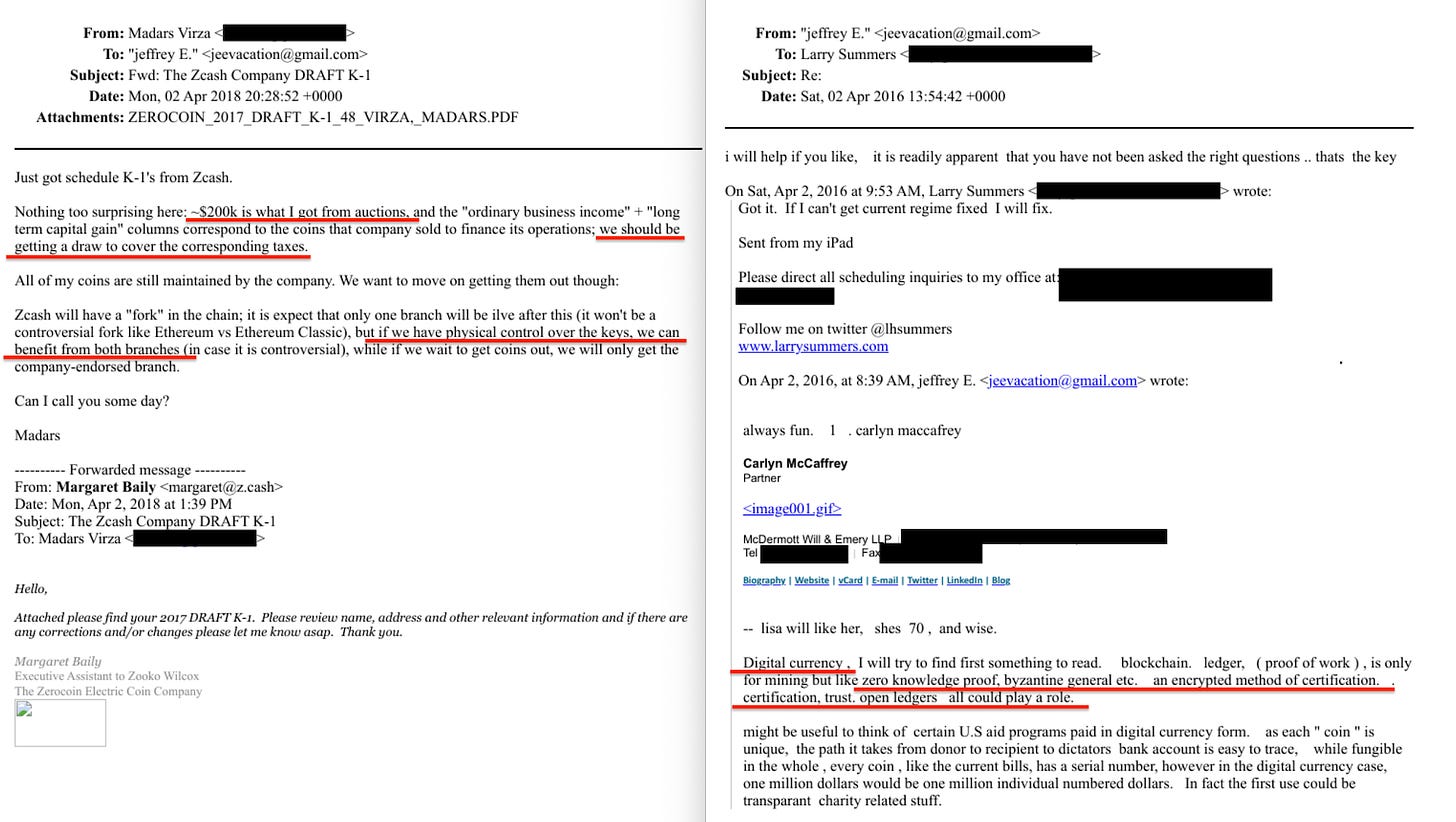 Virza’s relationship with Epstein was not limited to research funding. On 2 April 2018 — one month before that Sunday schedule — Virza forwarded Epstein his draft K-1 tax document from the Zcash Company, reporting approximately $200,000 in income from coin auctions. ‘We should be getting a draw to cover the corresponding taxes’60, Virza wrote, then briefed Epstein on an upcoming Zcash fork and the advantage of extracting coins before it happened: ‘if we have physical control over the keys, we can benefit from both branches’.