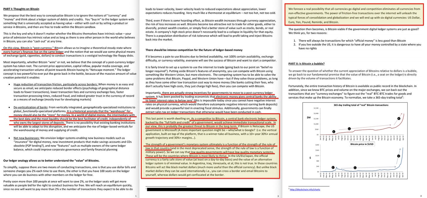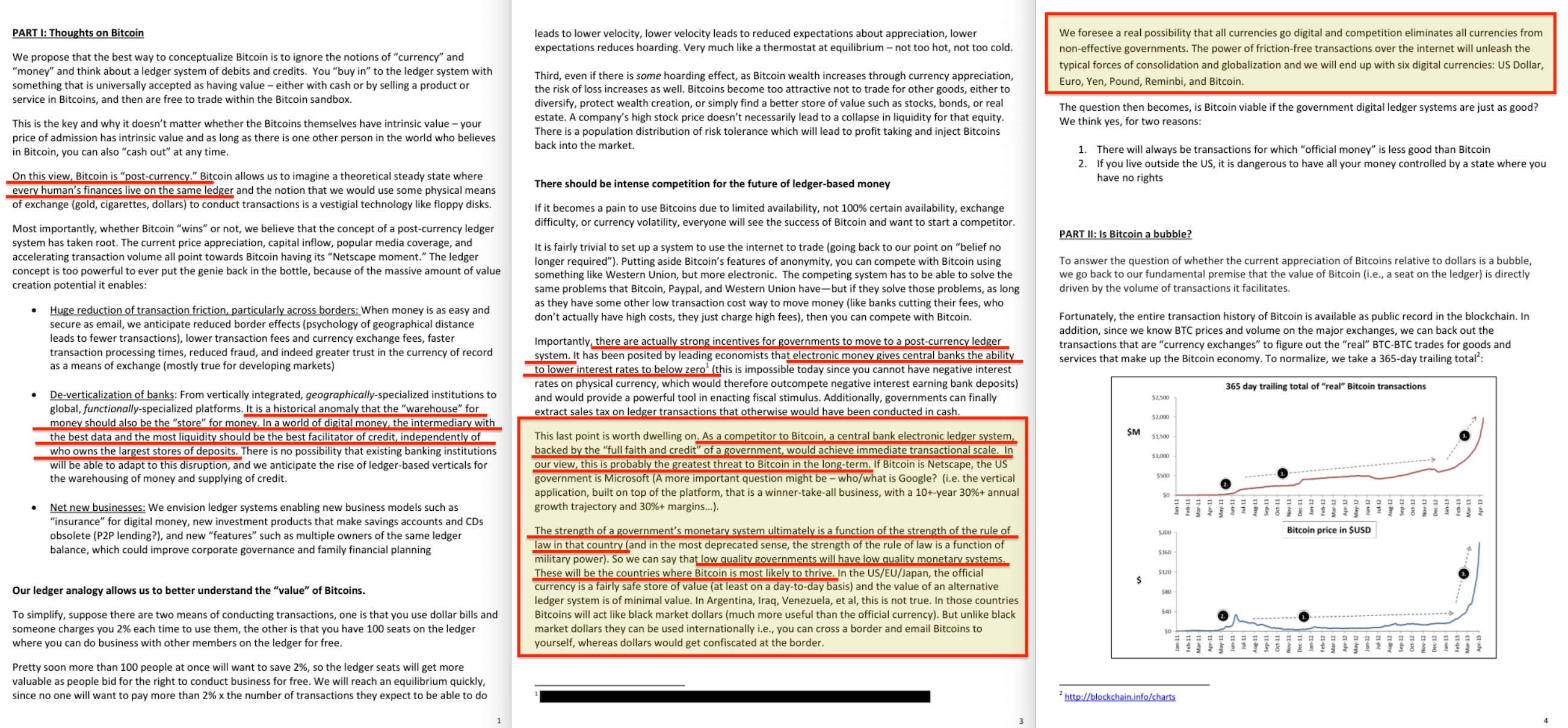 A central bank electronic ledger system, backed by the ‘full faith and credit’ of a government would outcompete Bitcoin through ‘immediate transactional scale’. ‘If Bitcoin is Netscape, the US government is Microsoft’. The document asked who would be ‘Google’ — ‘the vertical application, built on top of the platform, that is a winner-take-all business’.